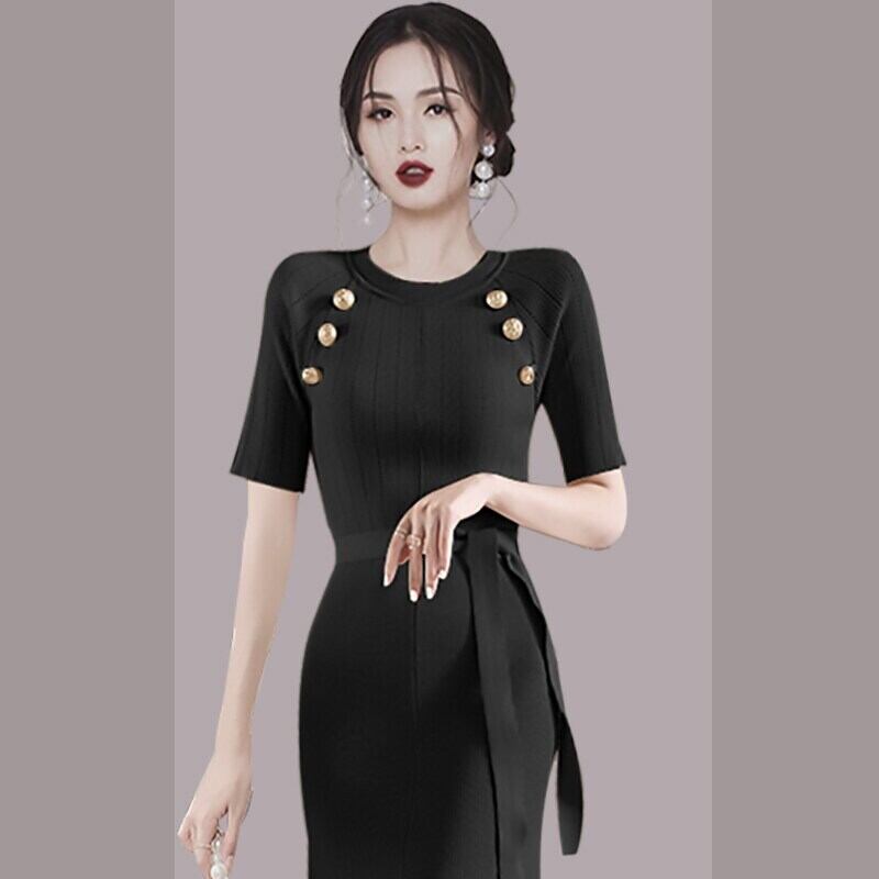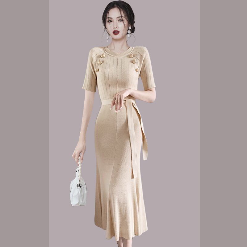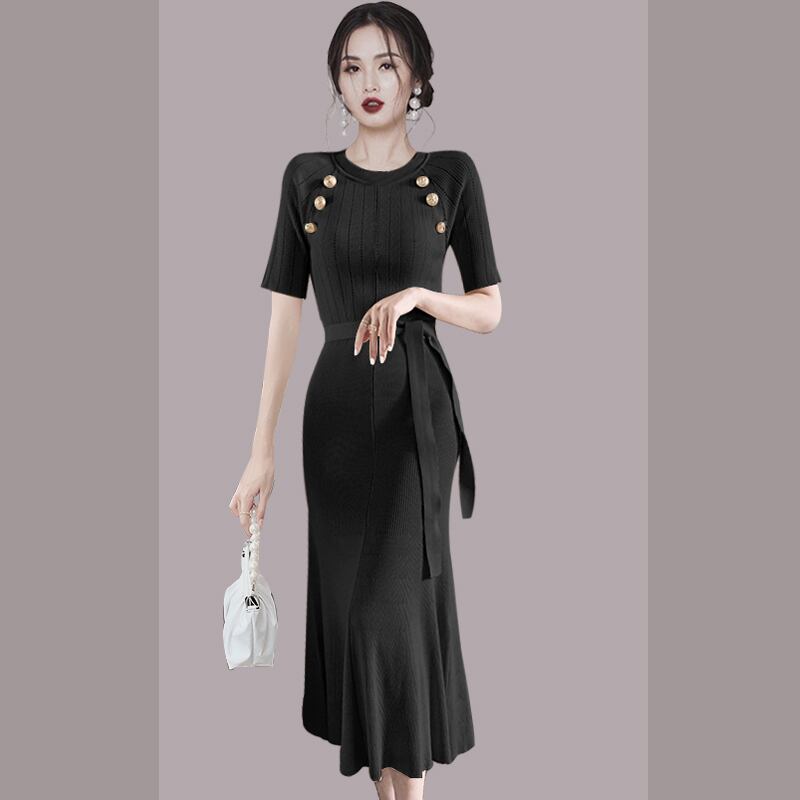 ヴィンテージニットマーメイドドレス女性半袖OネックベルトペンシルドレスパーティーロングVestidos ショート ハーフスリーブ ハーネス ビンテージ