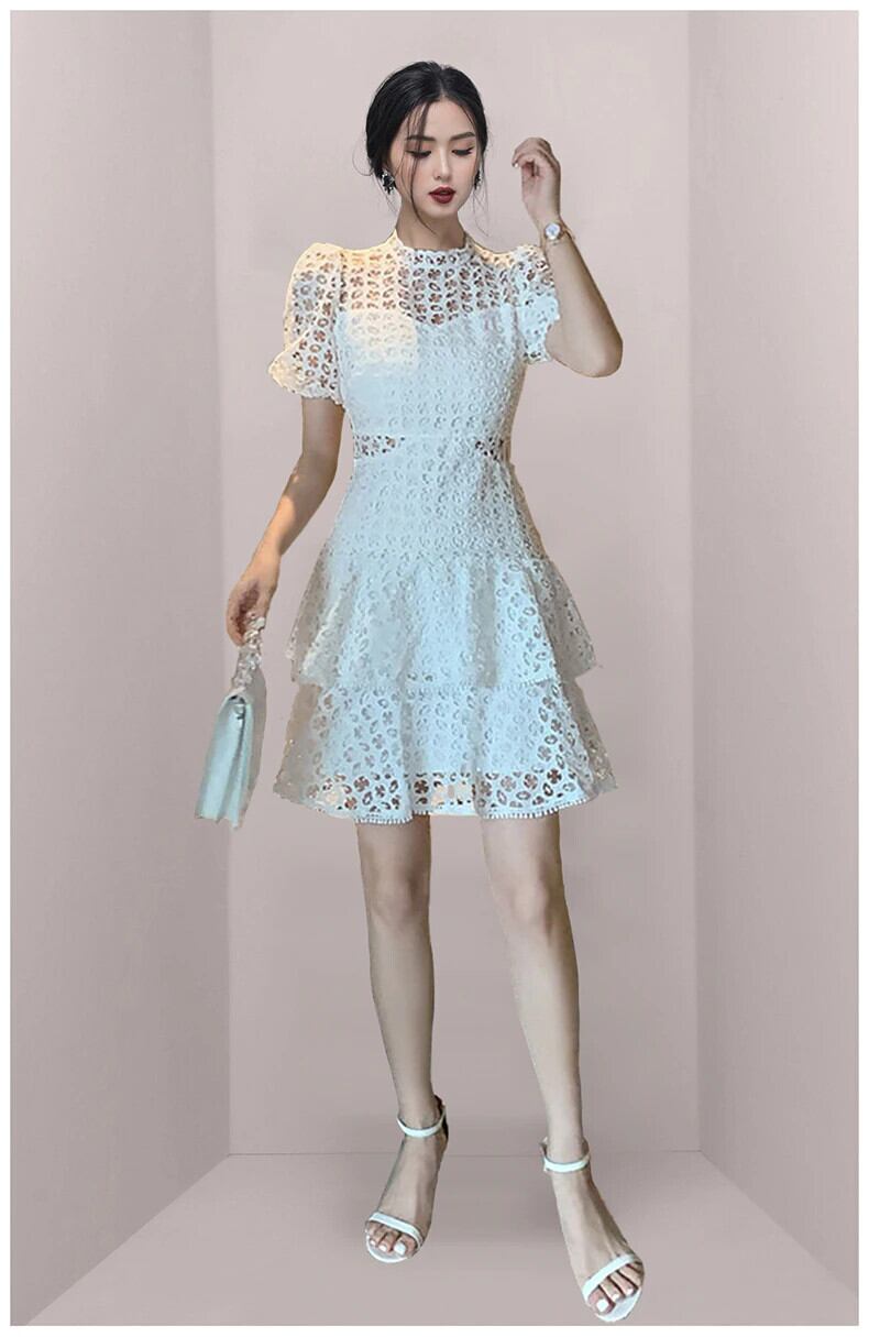 ホワイトパッチワークドレス女性スタンドカラーパフ半袖ウエストホローアウトドレスs2021年夏スタイル ショート ハーフスリーブ サマー 夏物