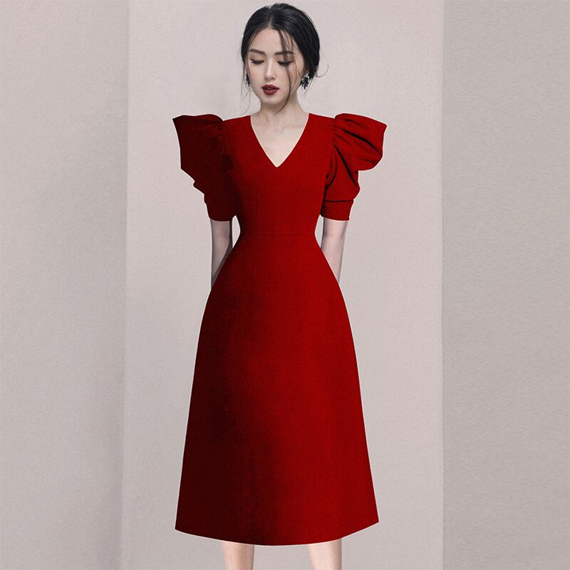 シックなパフスリーブボディコンドレスオフィス赤女性夏Vネックミディドレス半袖スリムウエストドレス ショート レッド ハーフスリーブ サマー 夏物 会社 学校 通勤や通学にも
