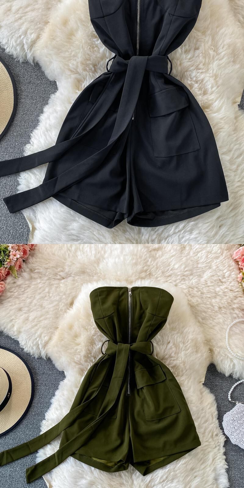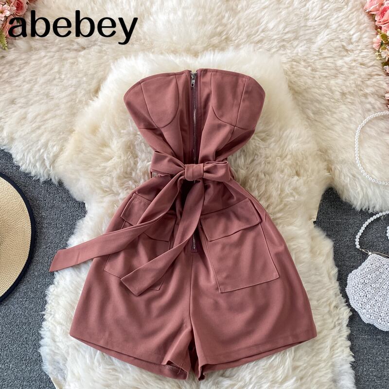 スラッシュネックオフショルダージッパーロンパースレディースサマーウエストワイドレッグポケットカーゴプレイスーツサッシ付き2021 夏物 ワイドパンツ