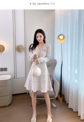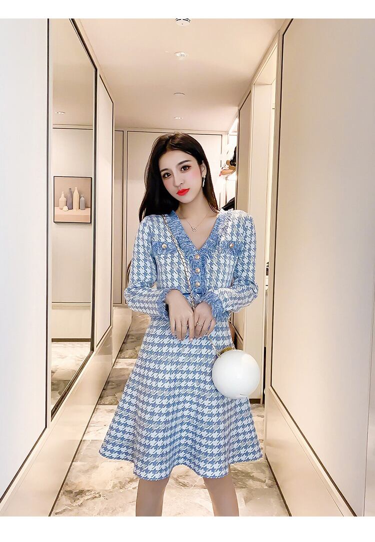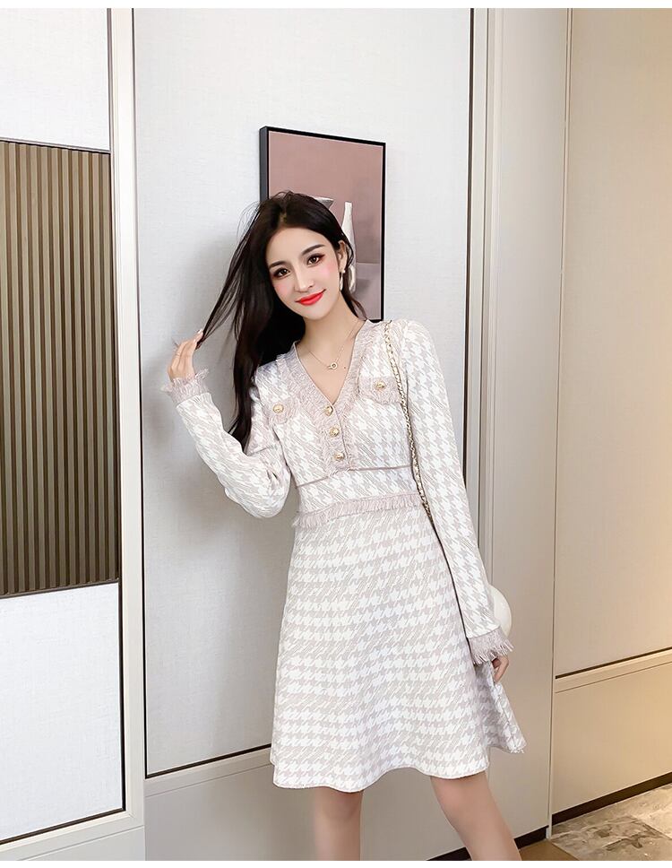秋のレディースドレスチェック柄Vカラースリム長袖Telsニットドレス ロング オータム 秋物