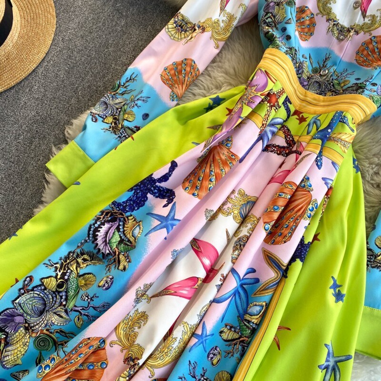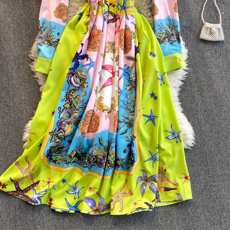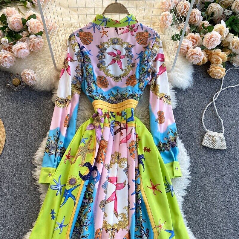 女性のプリントドレスレトロなターンダウン-襟の長袖Aラインドレス春のボヘミアンバケーションロングドレス スプリング 春物