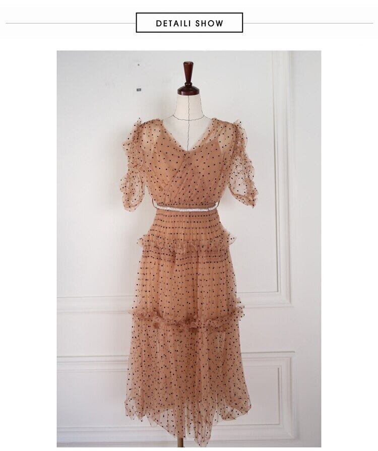 2021年夏到着レディースドレスフロントとバックVネックセクシーウェーブポイントメッシュスリムロングミディドレスベルト付き サマー 夏物 ハーネス