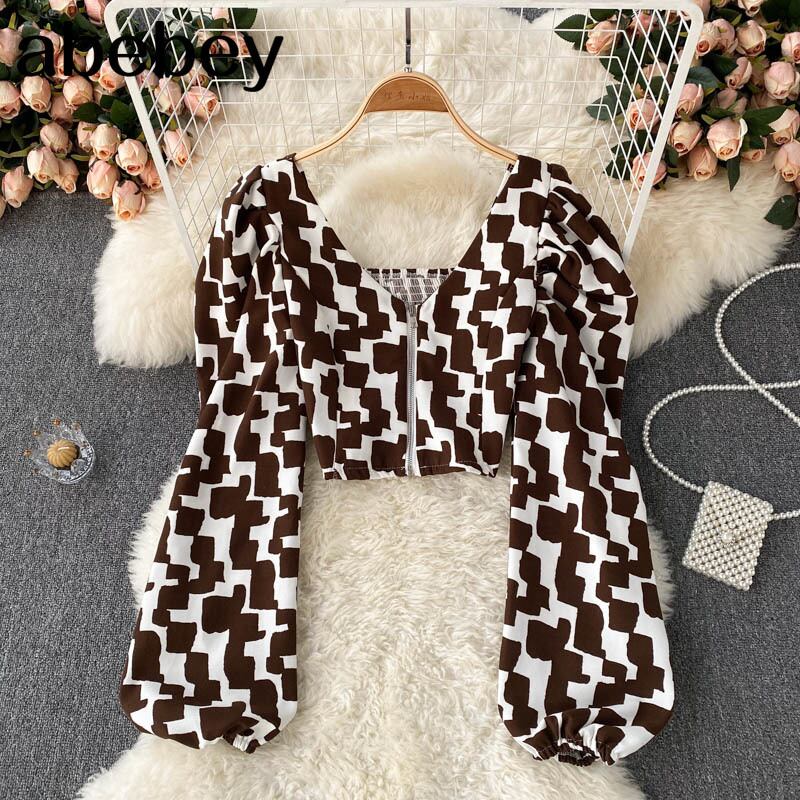 女性レトロプリントブラウスパフスリーブVネックジッパートップス秋の伸縮性シャーリングストリートウェアショートブラウス エラスティック オータム 秋物