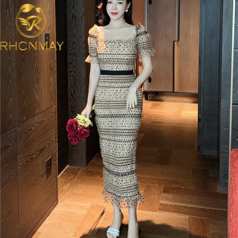 夏の女性ミディドレスパフスリーブパッチワークドットプリントパーティードレスvestidos サマー 夏物