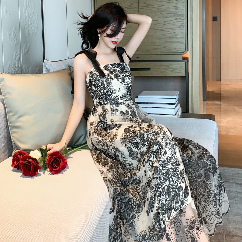 刺繡メッシュレースドレス女性スパゲッティストラップロングミディドレスヴィンテージサマーパーティードレスフレンチランウェイ 刺繍 夏物 ビンテージ