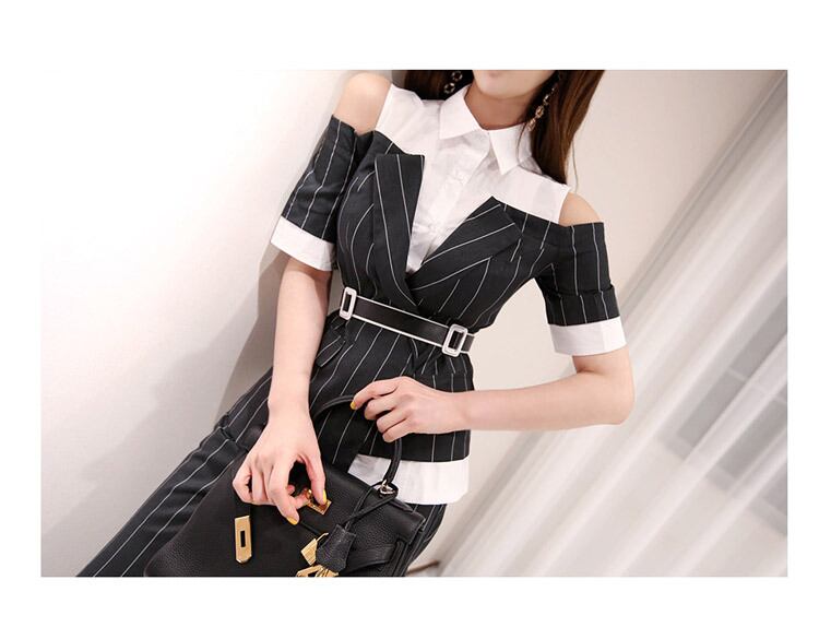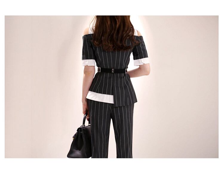 オフィスストライプ2点セットレディースパッチワーク半袖サッシュトップス+ウエストパンツセットレディースセット ショート ハーフスリーブ 会社 学校 通勤や通学にも