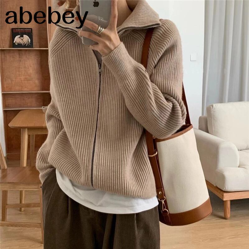 春のルーズジッパーセーターカーディガン長袖ソリッドニットアウトウェアトップスニットウェア2021 ロング スプリング 春物 ソリッドカラー
