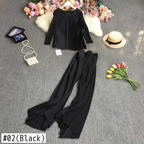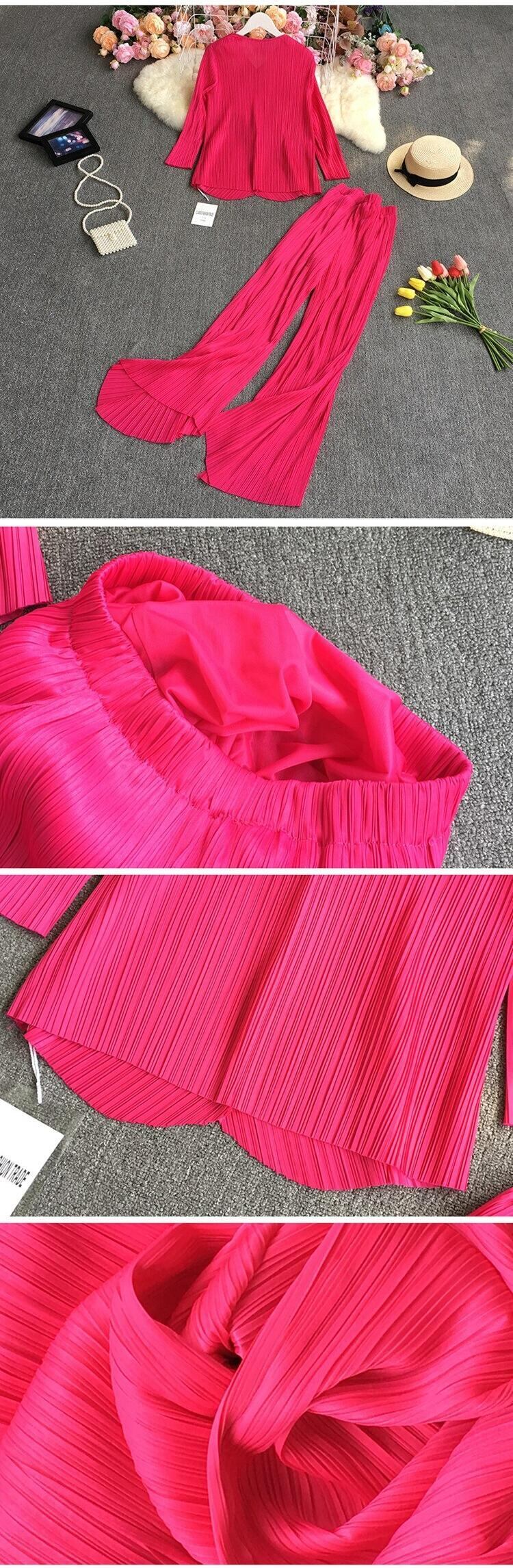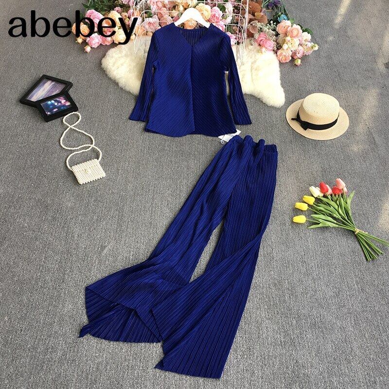 2021年春秋Vネック長袖プリーツトップ+ハイウエストカジュアルワイドレッグヘビーワークプリーツパンツ2点セット ハイウェスト ロング スプリング 春物 オータム 秋物 ワイドパンツ