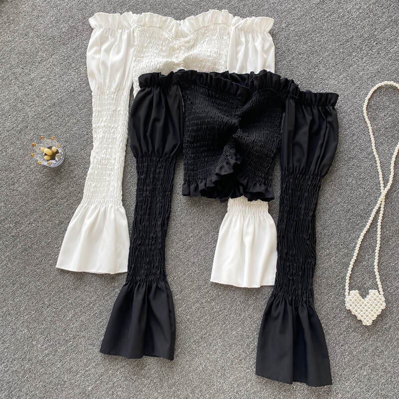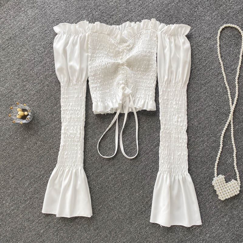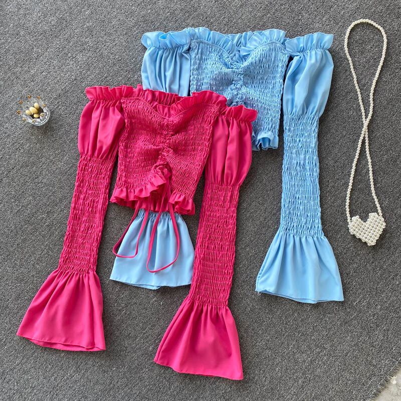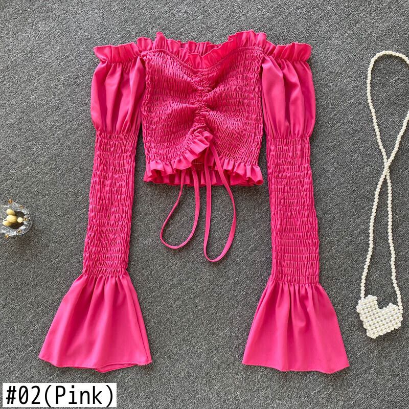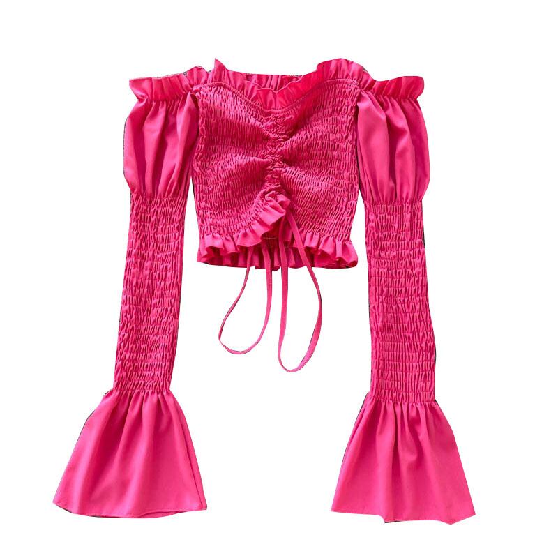 女性ブラウスセクシースラッシュネック長袖伸縮性シャーリングトップ秋オフショルダーストリートウェアショートブラウス ロング エラスティック オータム 秋物