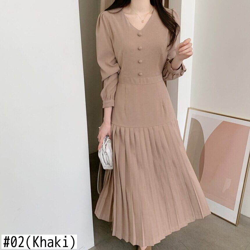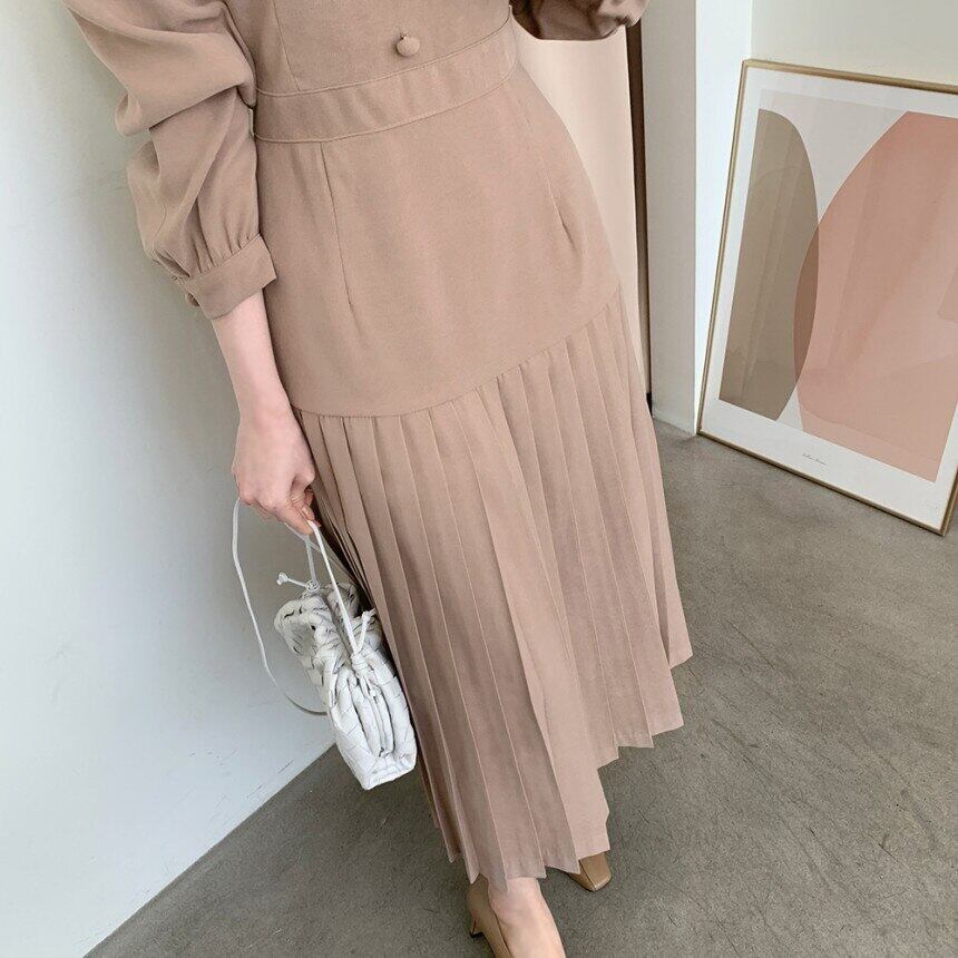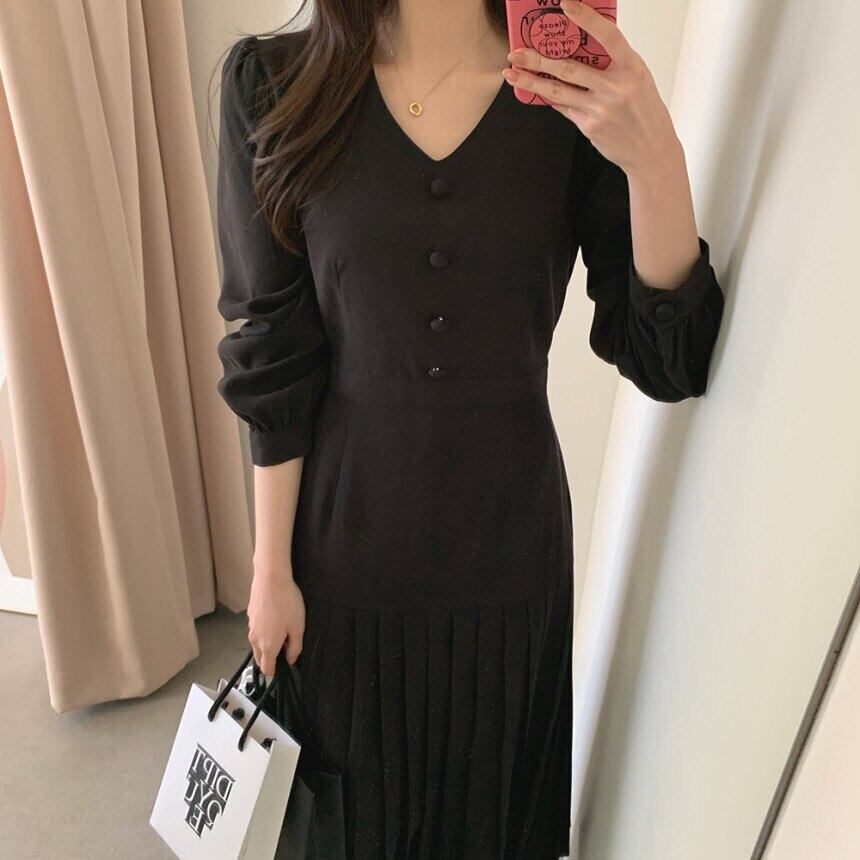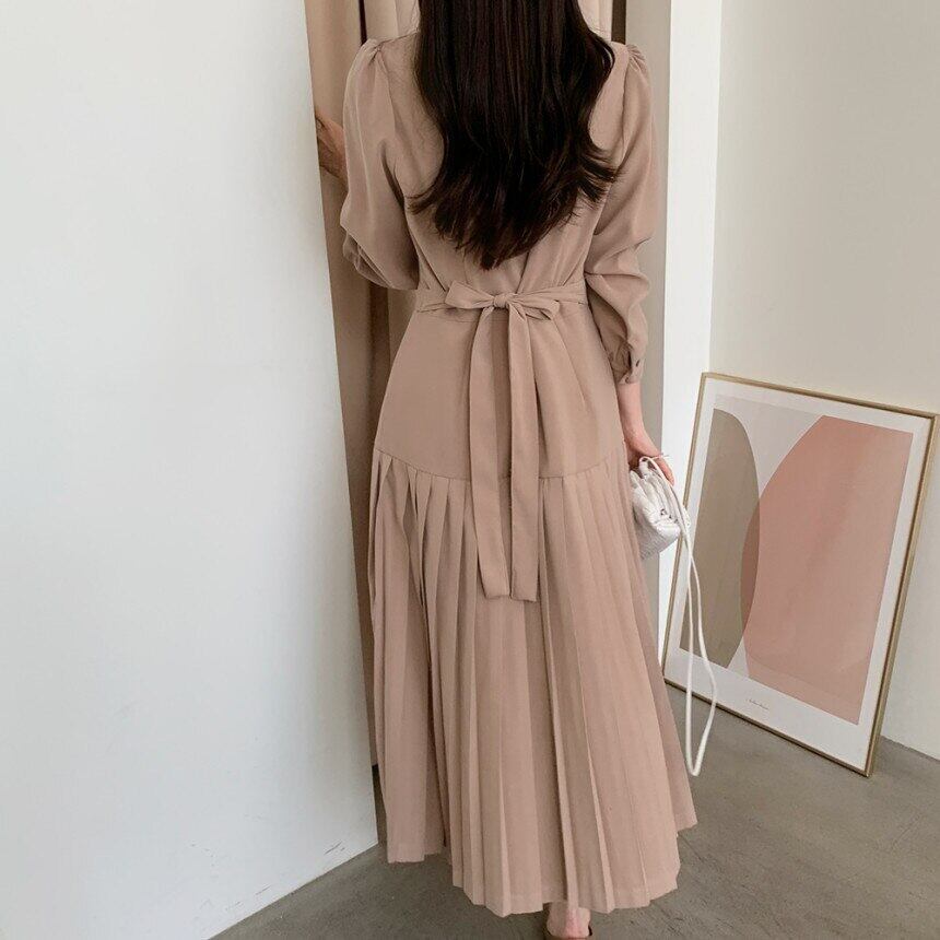 シックな女性のドレスVネック長袖サッシ包帯プリーツドレス女性のオフィスシングルブレストドレス2021 ロング 会社 学校 通勤や通学にも
