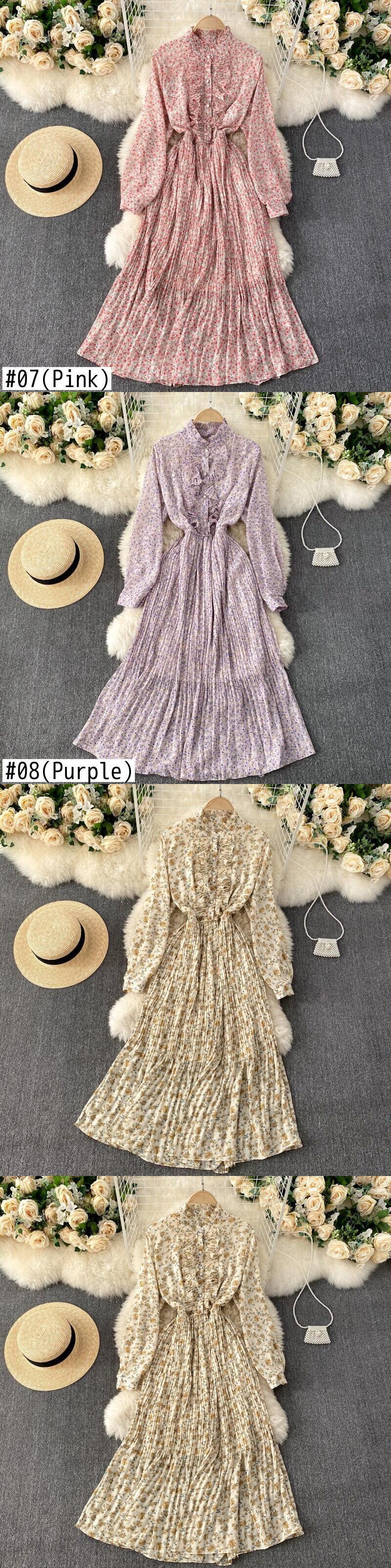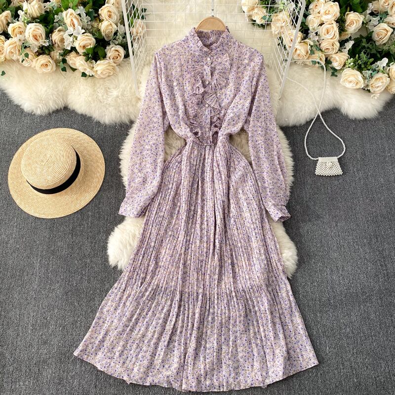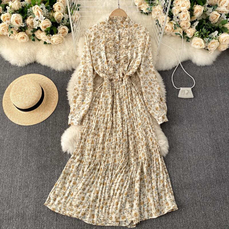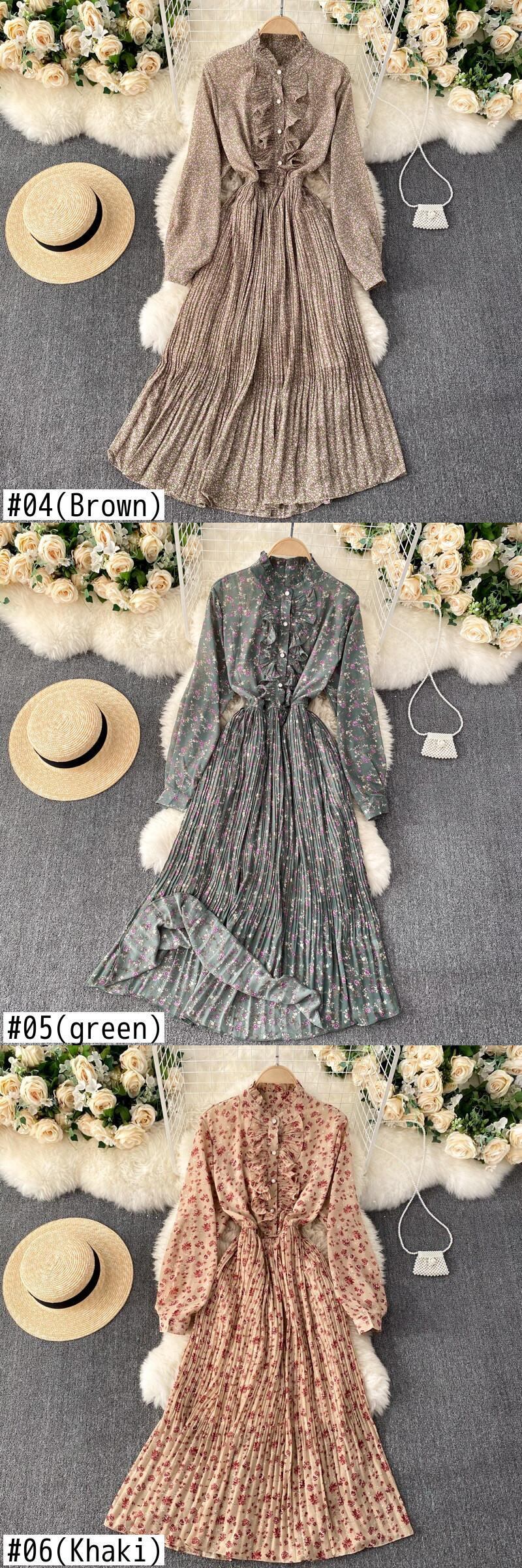 女性プリーツフローラルドレスフレンチスウィートスタンドカラーボタンフリルAラインドレスオータムボヘミアンプリントミディドレス ラッフル 大人ガーリー キュート カジュアル 秋物 花柄