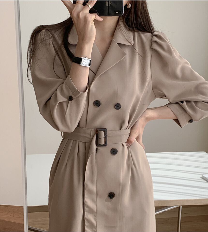 ロングドレス パフスリーブスタイル ヴィンテージ ダブルブレスト ワークオフィスドレス オータム 秋物 ビンテージ 会社 学校 通勤や通学にも