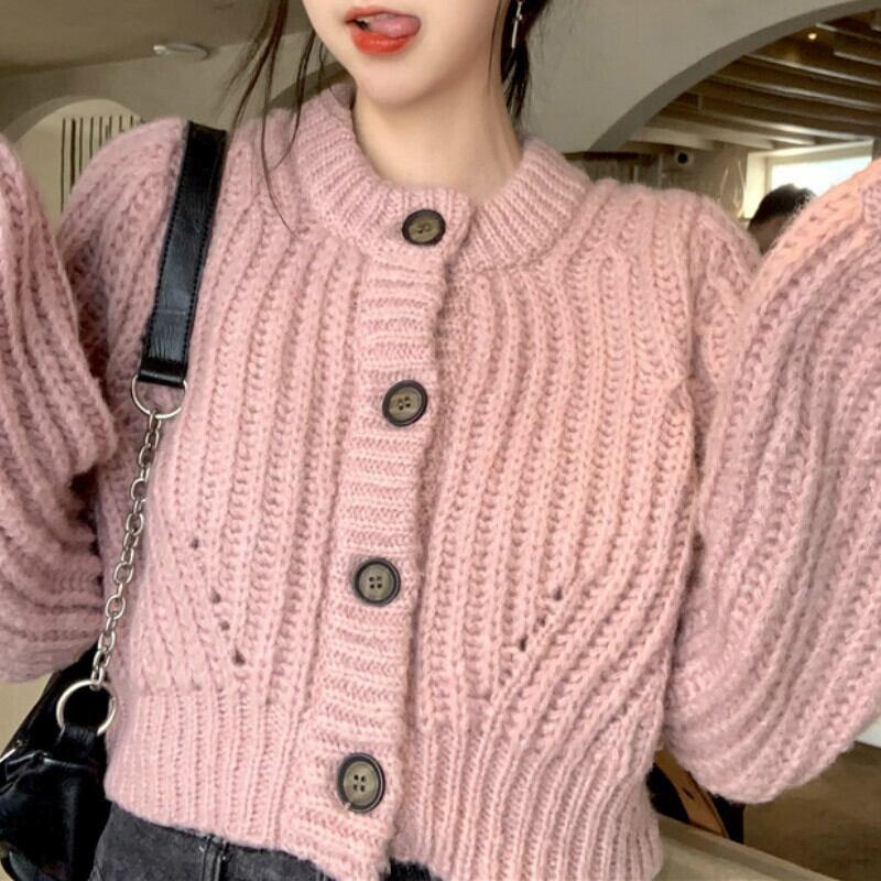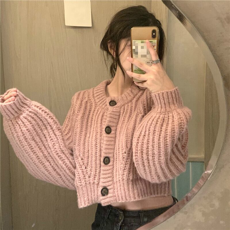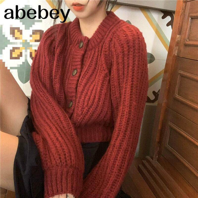 赤いニットセーター女性2021年冬のOネック厚手のルーズニットカーディガン暖かい上着クロップトップ レッド ウィンター 冬物