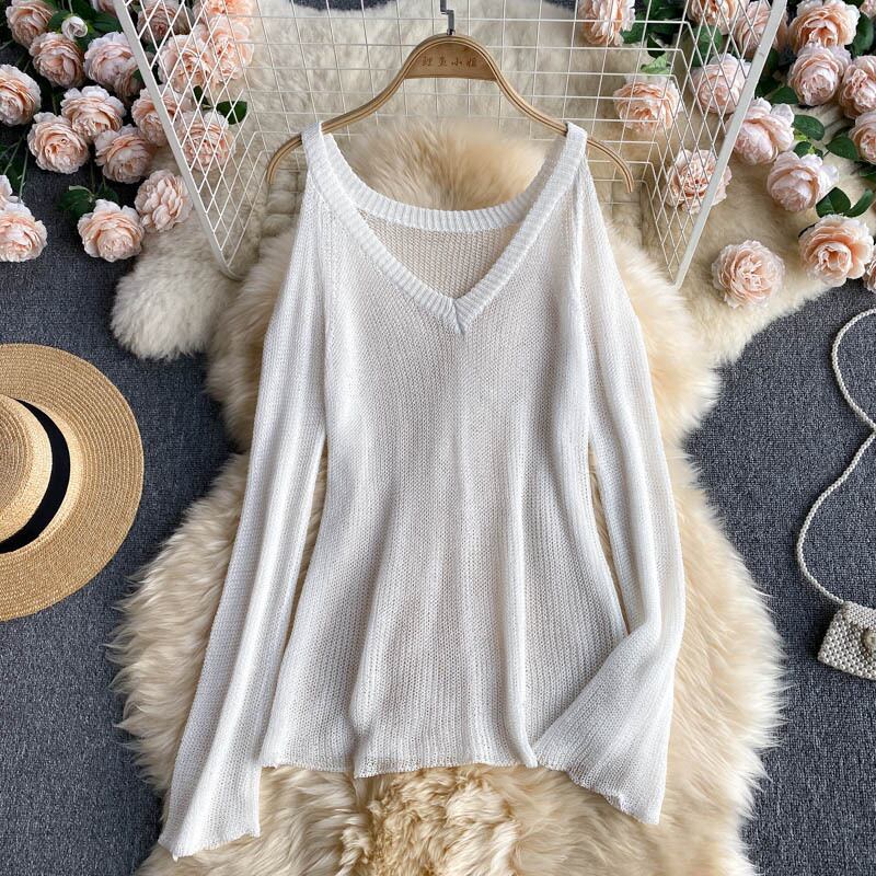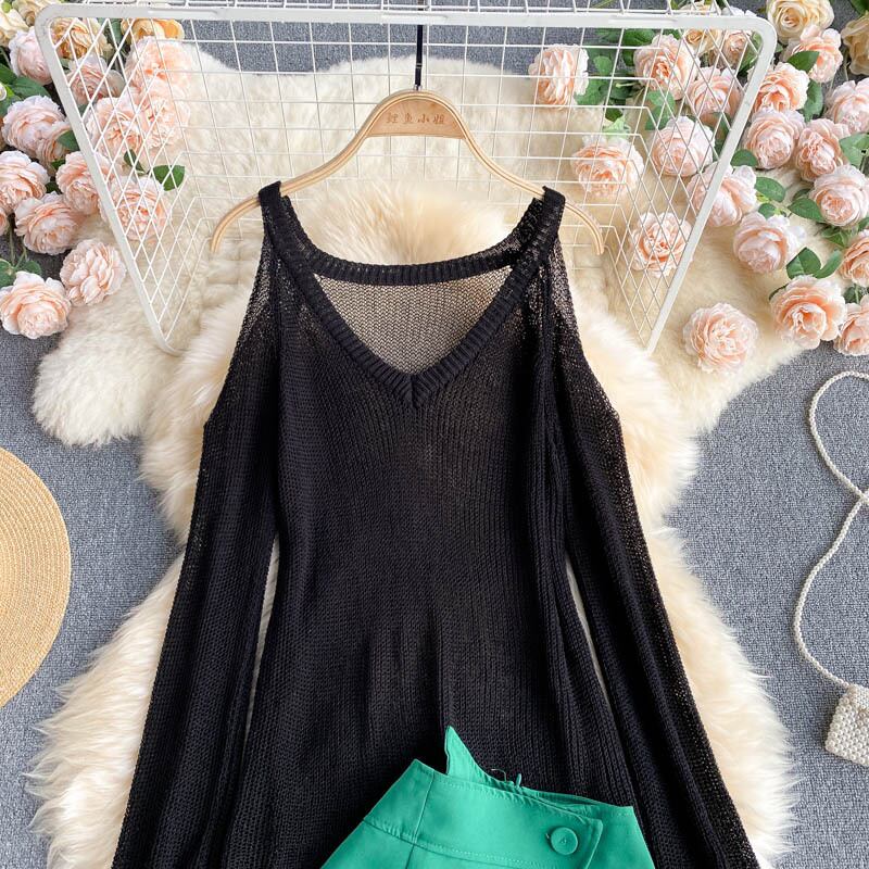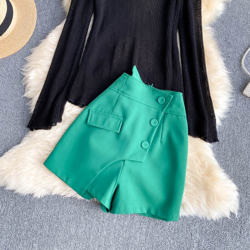 女性の夏のストリートウェアセットセクシーなオフショルダー長袖ニットトップ+ウエストショーツツーピーススーツ ロング サマー 夏物 ブルマー