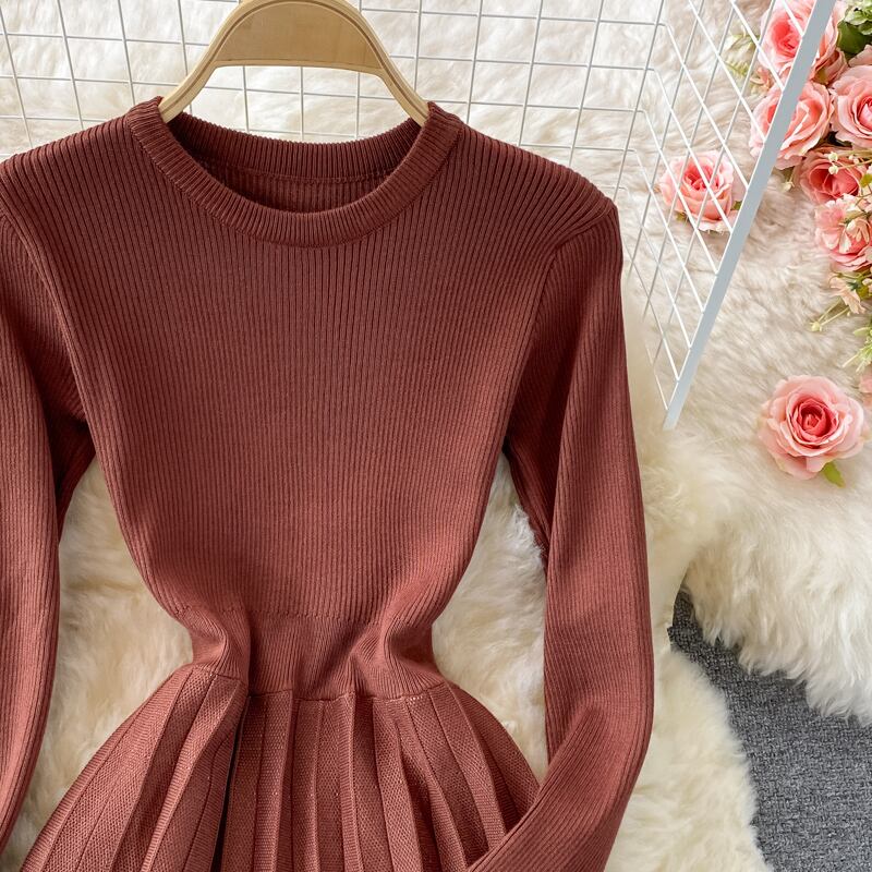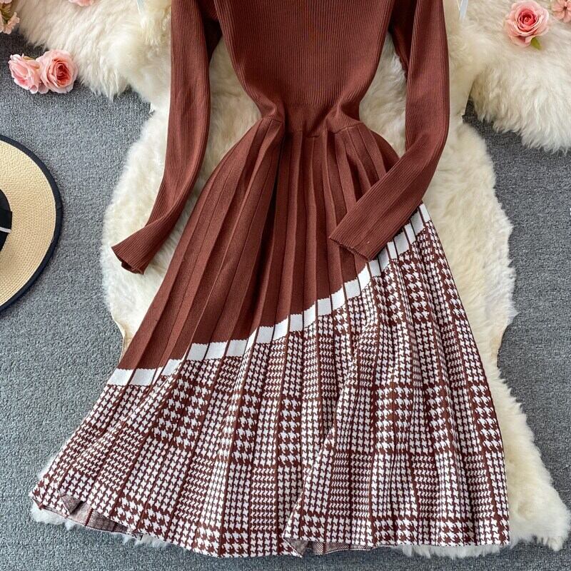 秋冬チェック柄ステッチニットワンピースレディースミディプリーツAラインワンピースガールロングスリーブニットロングワンピース 長袖 オータム 秋物 ウィンター 冬物
