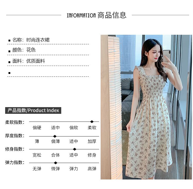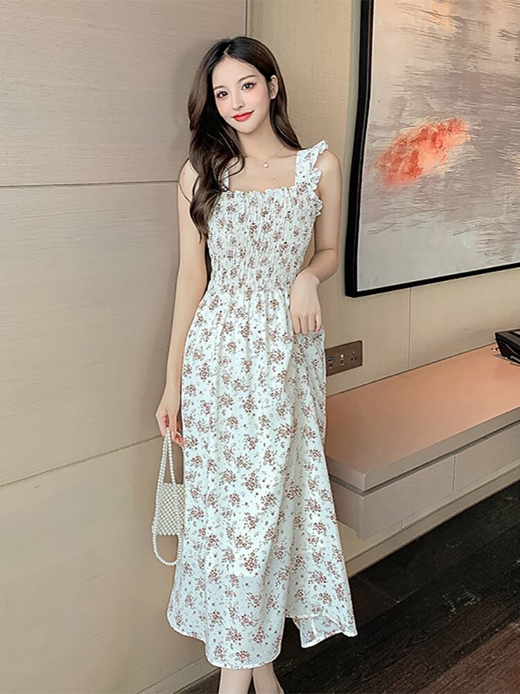 2021年版レディーススクエアネックミッドロングドレスフレンチレトロサスペンダーフラワー伸縮性ウエストワンピース エラスティック フラワーデザイン スクウェア