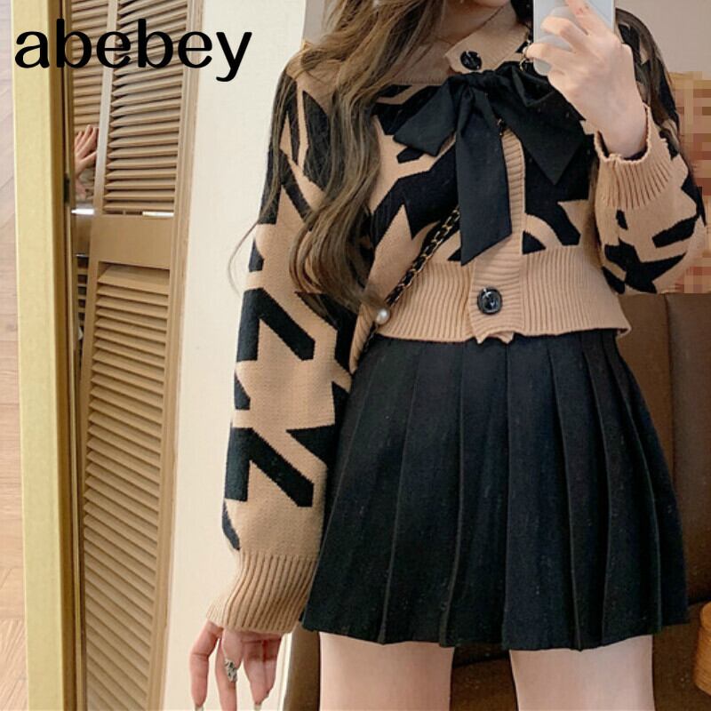 ボウノット ニット カーディガン レディース Oネック 幾何学アウトウェア 秋冬 原宿 クロップ トップス セーター かわいい オータム 秋物 ウィンター 冬物