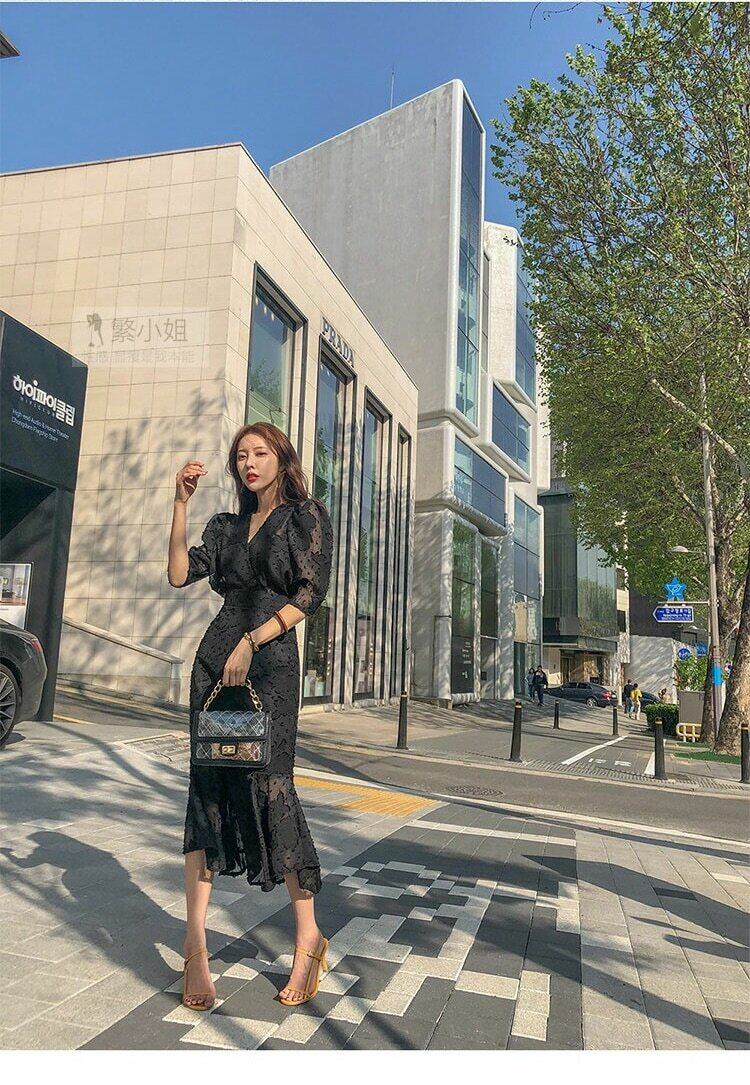 春スタイル ミディアム マーメイドドレス シフォン 七分袖 ボディコンフリル パーティードレス ラッフル スプリング 春物 会社 学校 通勤や通学にも