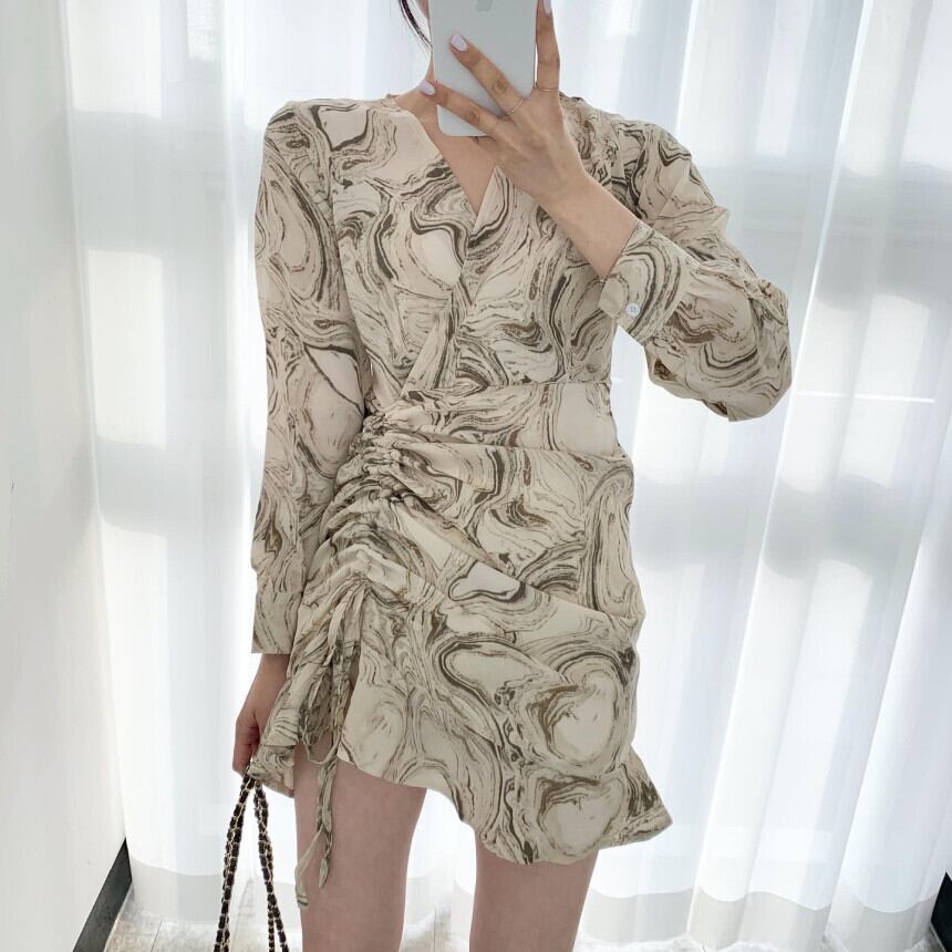 春夏レディース巾着折りドレスV襟ウエスト長袖ヴィンテージインク印刷ロングドレス2021 スプリング 春物 サマー 夏物 ビンテージ