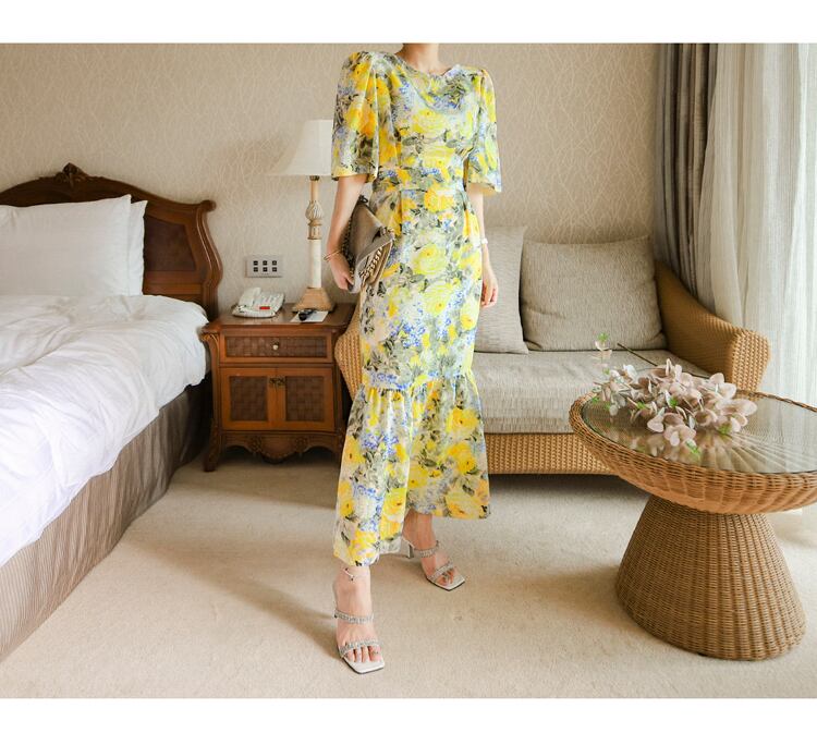 Oネックスリムウエストフレアスリーブマキシドレス夏の女性のヴィンテージフラワープリントマーメイドドレスVestidos サマー 夏物 フラワーデザイン ビンテージ