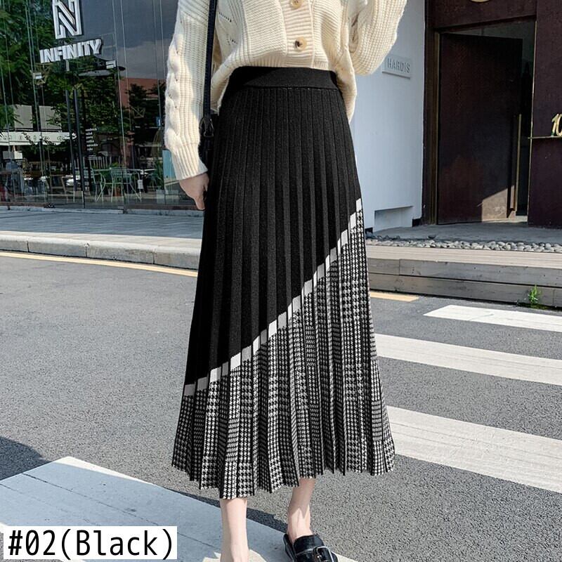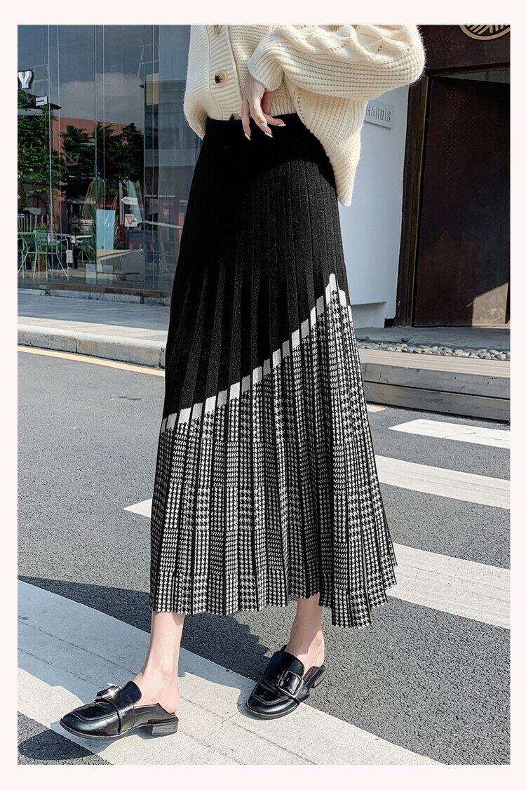ラグジュアリー幾何学ロングニットレディースプリーツスカート秋冬厚手ウォームAラインスカートエルガントニットセータースカート オータム 秋物 ウィンター 冬物