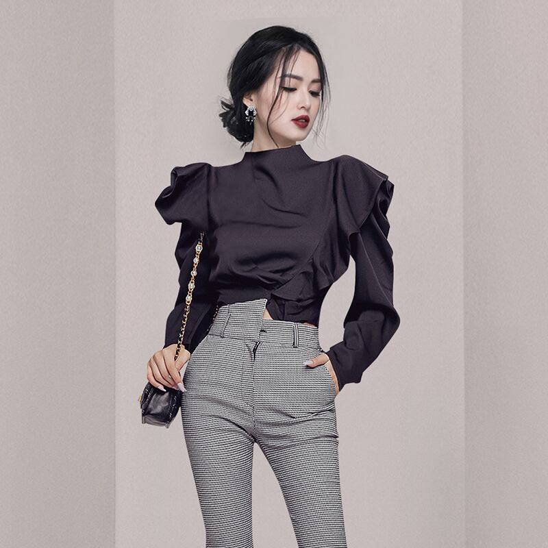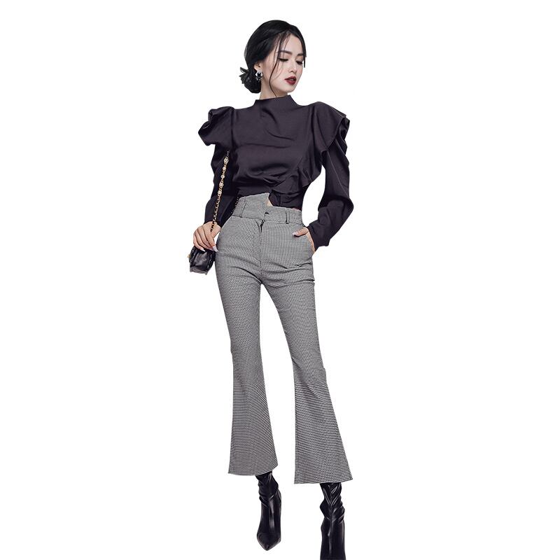 シンプルな秋のレディースセットフリルショートトップ+ウエスト千鳥格子スリムフィットフレアパンツ職業2ピーススーツ レッド ラッフル オータム 秋物