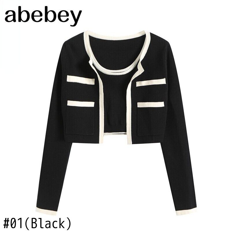 2021トップスツーピースVネック長袖ニットカーディガンセータージャケット+コントラストカラーショートベスト ロング