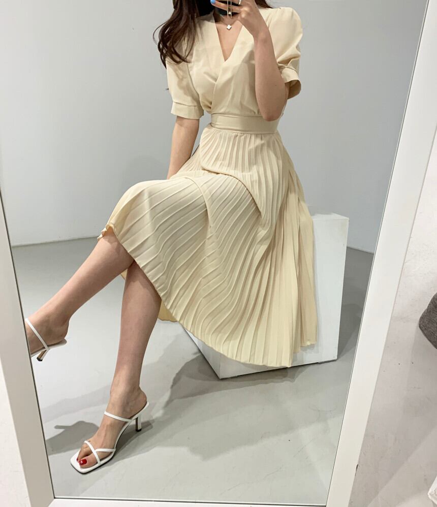 サマーシフォンAラインプリーツロングドレスレディース半袖Vネックベルト付きオフィスVestidos ショート ハーフスリーブ 夏物 ハーネス 会社 学校 通勤や通学にも