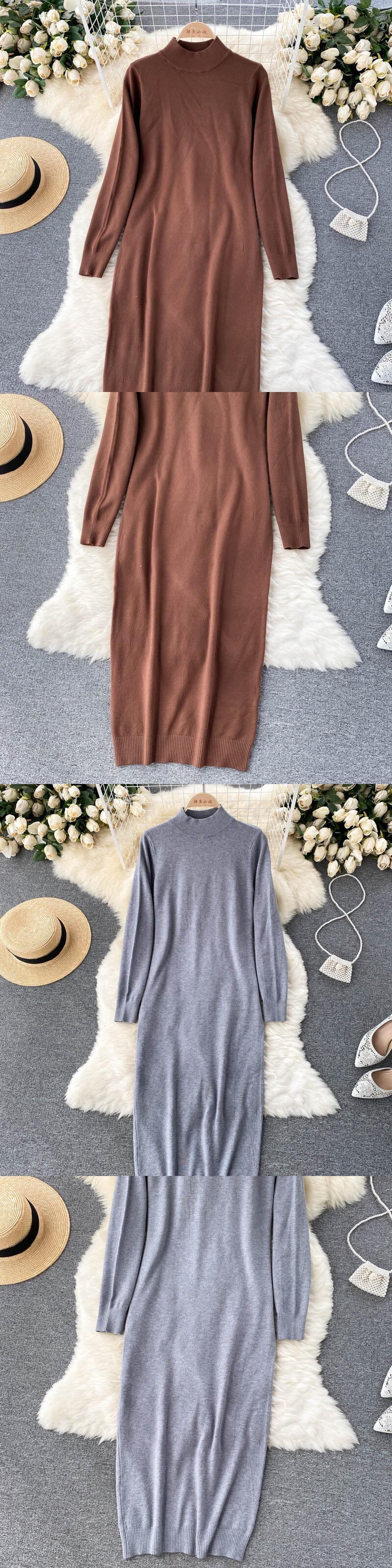 女性秋ニットドレススタンドカラー長袖伸縮性スリムペンシルドレス2021冬ボディコン暖かいセータードレス ロング エラスティック オータム 秋物 ウィンター 冬物