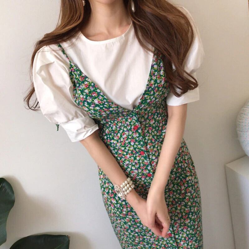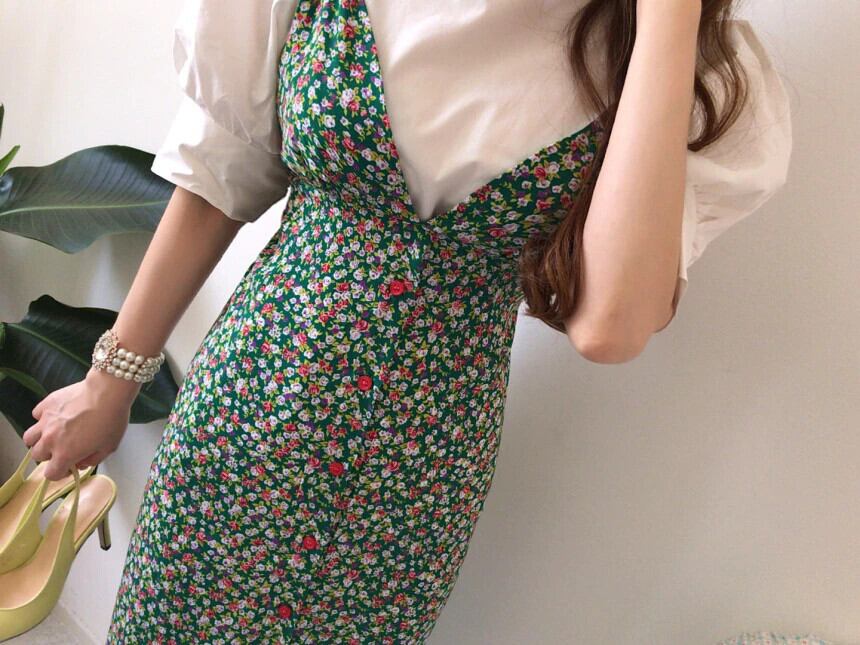 女性2ピースセットスタイルシックなヴィンテージOネックパフスリーブシャツシングルブレストフローラルスプリットダンガリードレスレディ 花柄 ビンテージ