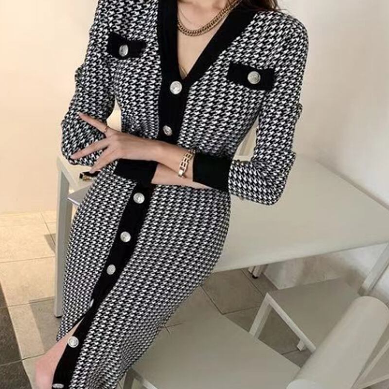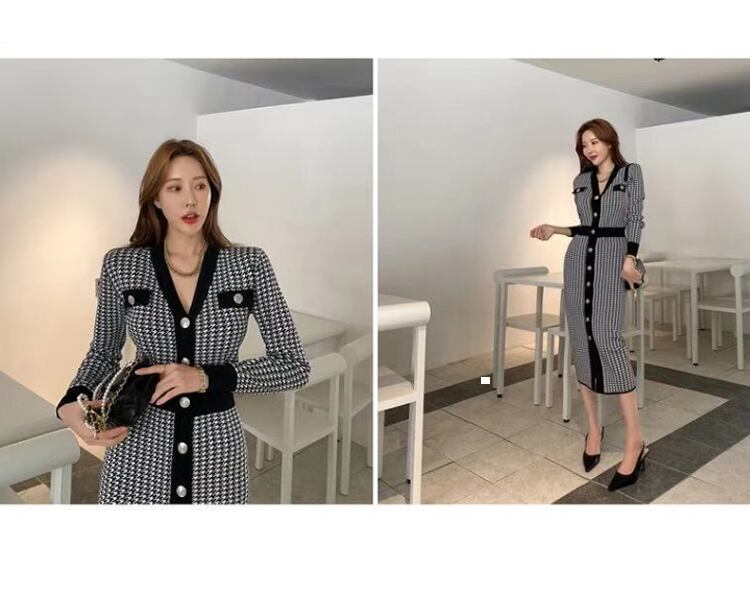 2021年女性チェック柄千鳥格子ニットドレス秋のレトロニットセーターローブワークストリートウェア冬ボディコンチェック柄ドレス オータム 秋物 ウィンター 冬物