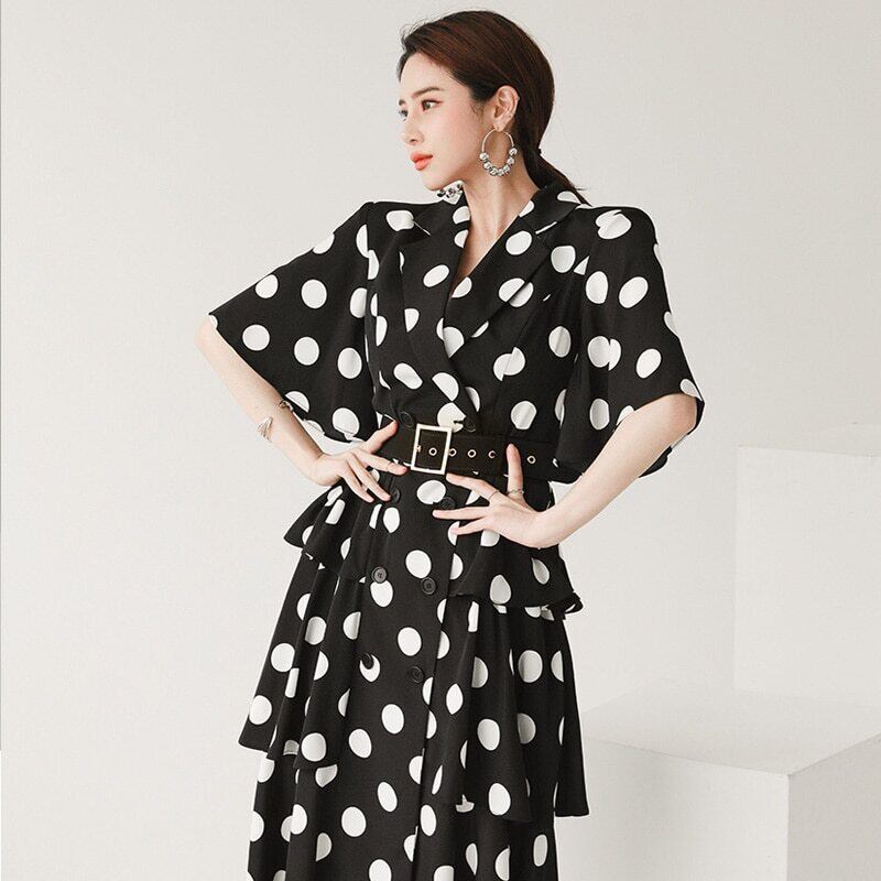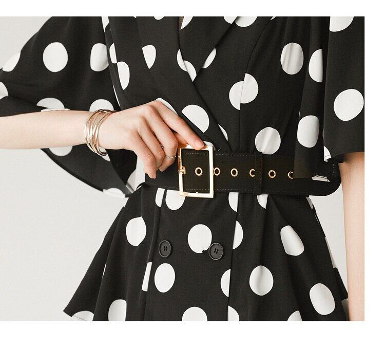 サマーソリッドドットフレアスリーブターンダウンカラーマキシドレスレディースヴィンテージオフィスレディAラインベルトパーティードレス 夏物 ハーネス ソリッドカラー ビンテージ 会社 学校 通勤や通学にも