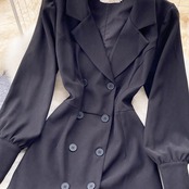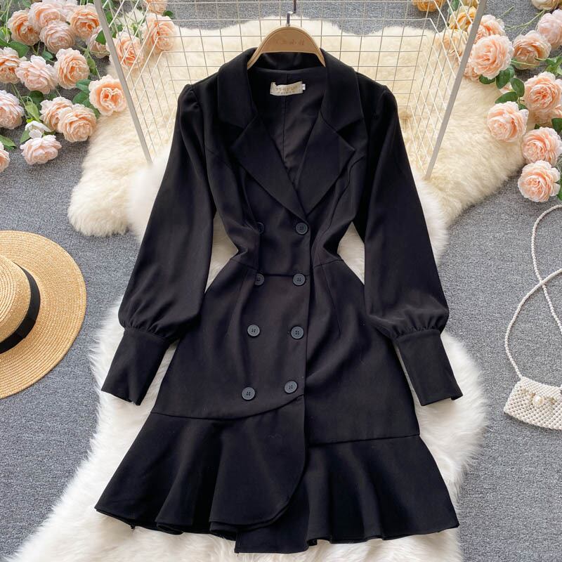 女性のドレス長袖ノッチ付き襟ダブルブレストAラインドレス秋のストリートウェアフリルドレス ロング ラッフル オータム 秋物