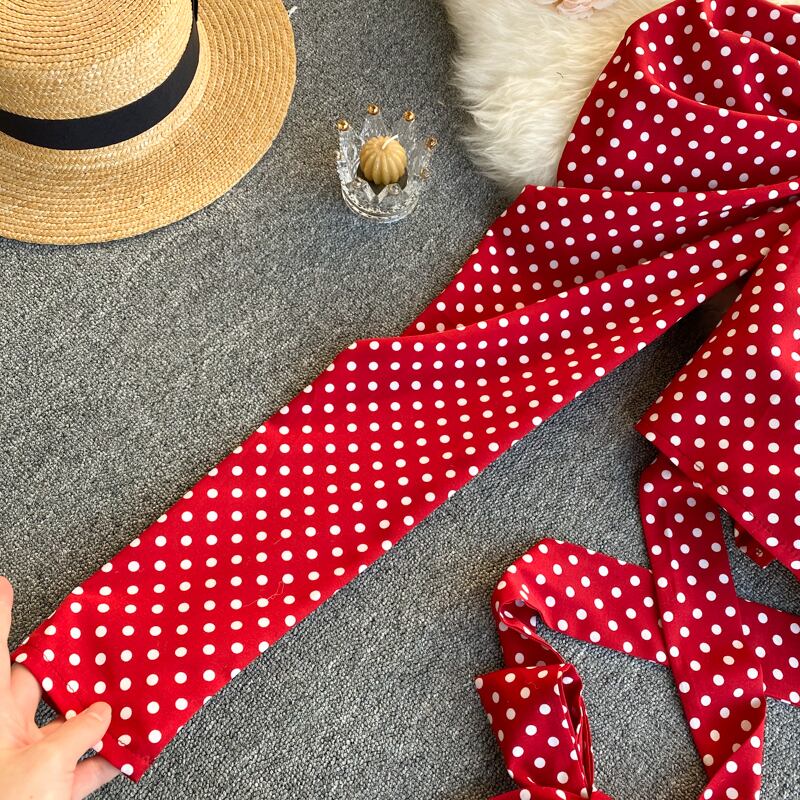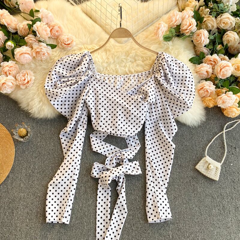 女性の水玉ブラウスレトロVネックパフスリーブレースアップスリムトップス春のセクシーなストリートウェアショートブラウス スプリング 春物