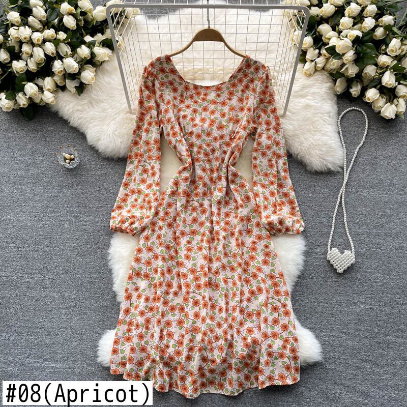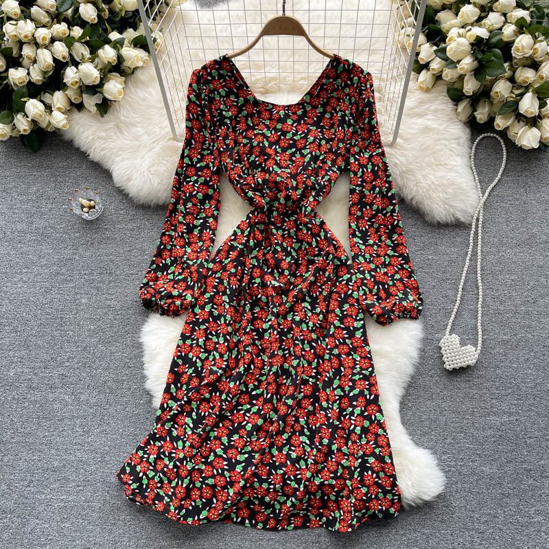 女性シフォンフローラルドレスレトロ長袖Aラインドレス秋フレンチボヘミアンプリントバケーションミディドレス ロング オータム 秋物 花柄