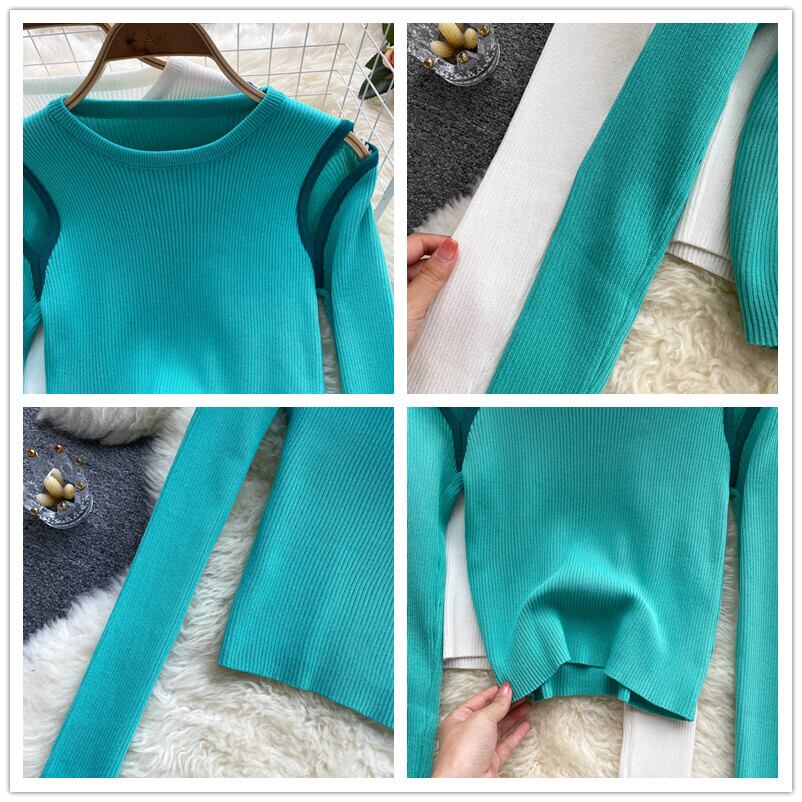 女性ニットプルオーバー中空オフショルダー長袖スリムセーター秋のストリートウェアショートトップ ロング オータム 秋物