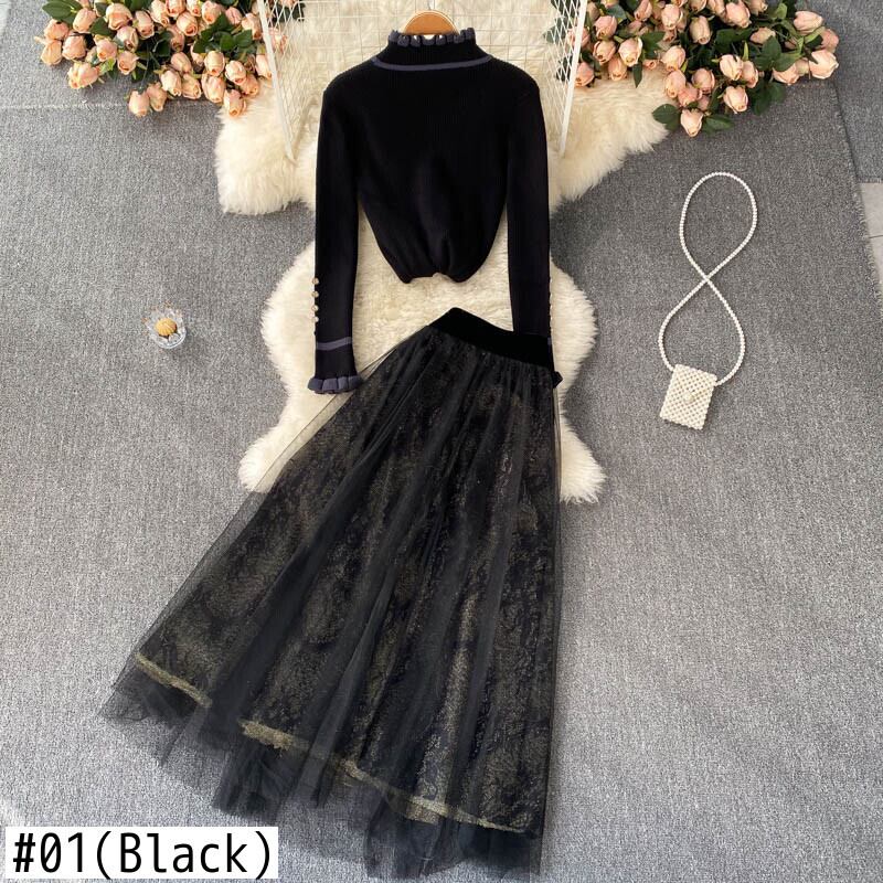 女性2021年秋セット長袖スリムニットトップス+ウエストAラインメッシュロングスカートツーピーススーツ オータム 秋物