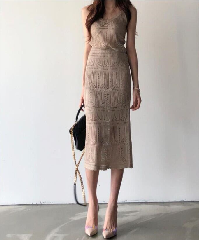 夏のセクシーな伸縮性ニット2ピースセット女性ノースリーブトップススパゲッティストラップ+ウエストロングスカートスーツスリム エラスティック サマー 夏物