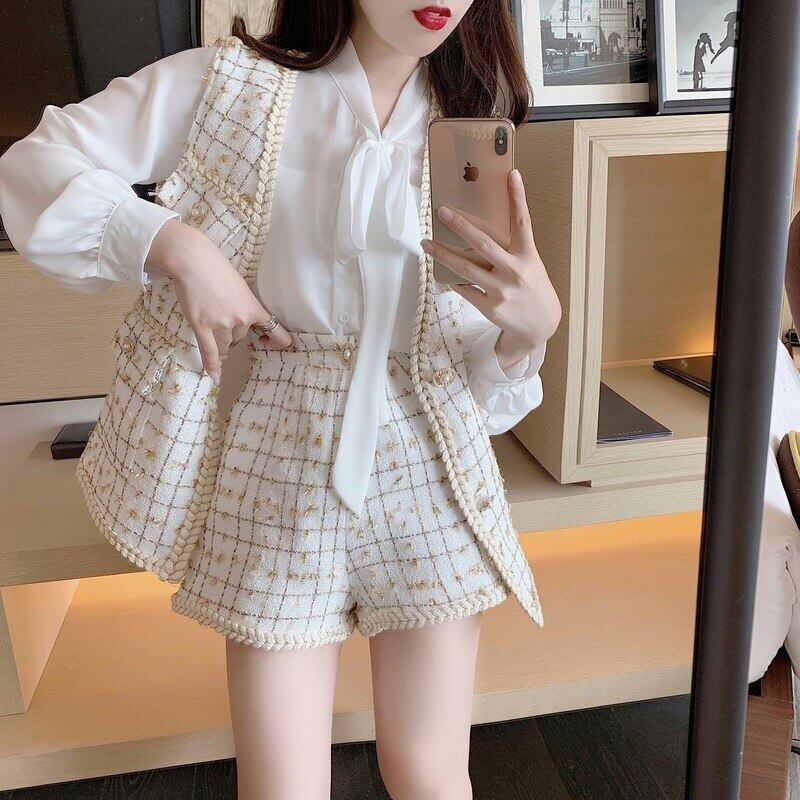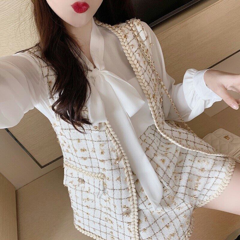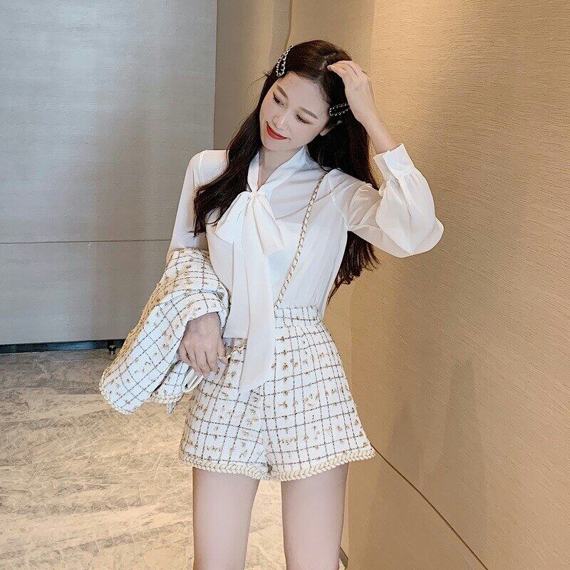 3ピーススーツイングランドスタイル秋のツイードジャケットシフォンシャツショーツセット衣装レトロマッチングセット オータム 秋物 ブルマー ヨーロピアン