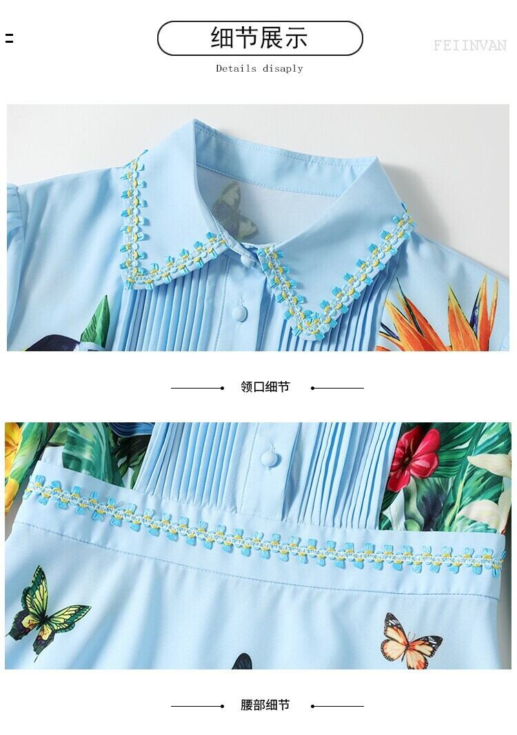 2021ランウェイサマーブルードレス女性長袖ヴィンテージジャングルアニマルフローラルプリントミニドレス ロング 夏物 花柄 ビンテージ