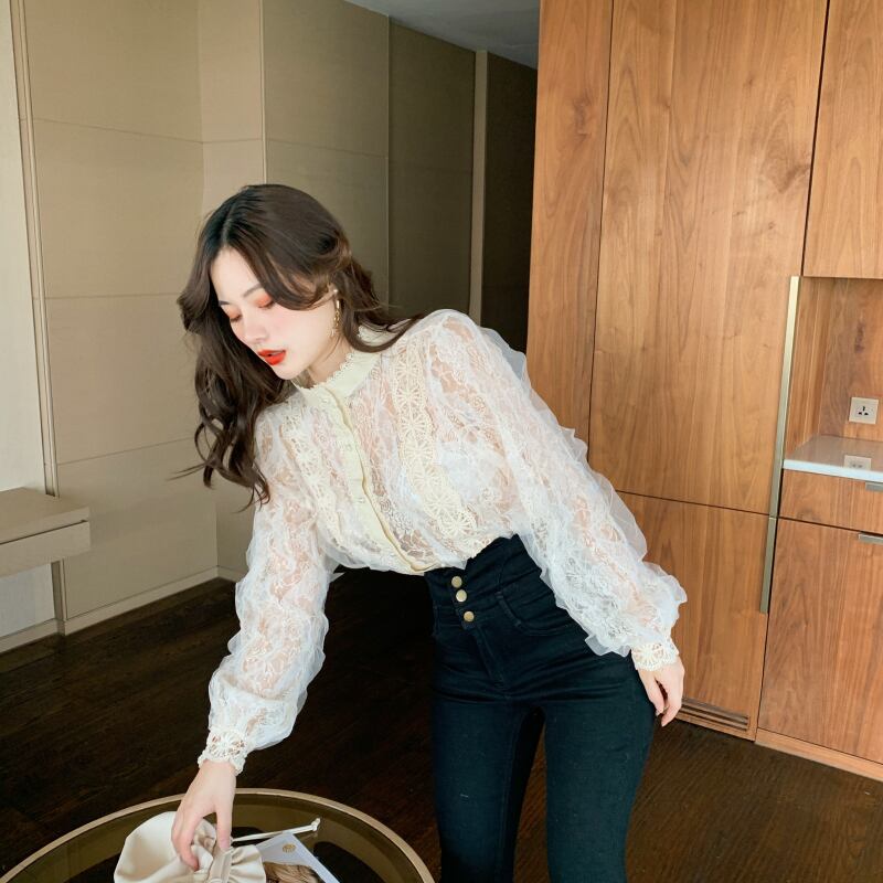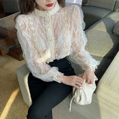 女性フローラルレースブラウス自由奔放に生きる長袖ホワイトトップス中空アウトシャツ秋春ブラウスストリートウェアS-XL ロング スプリング 春物 オータム 秋物 花柄