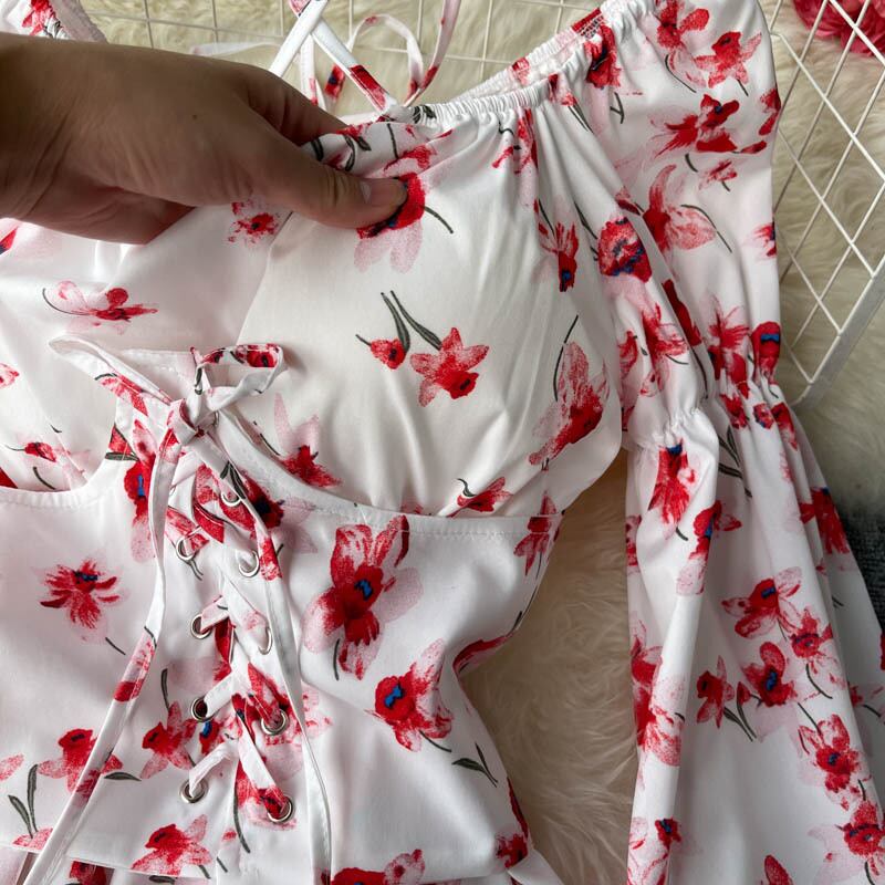 フラワープリントコルセットドレス女性ゴシック包帯ミニドレスセクシーオフショルダーフレアスリーブ春Vestidos スプリング 春物 フラワーデザイン