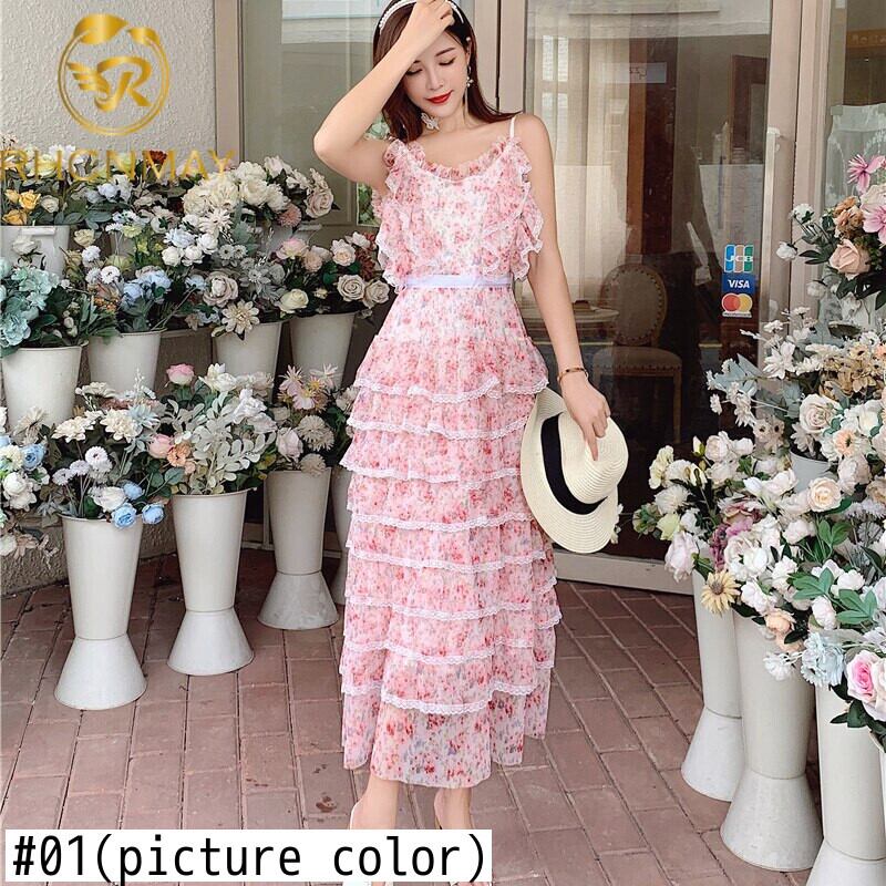 滑走路スパゲッティストラッププリントピンクフローラルドレス女性背中の開いたセクシーなカスケードフリルロングドレス2021スウィートレディドレス 大人ガーリー キュート カジュアル 花柄