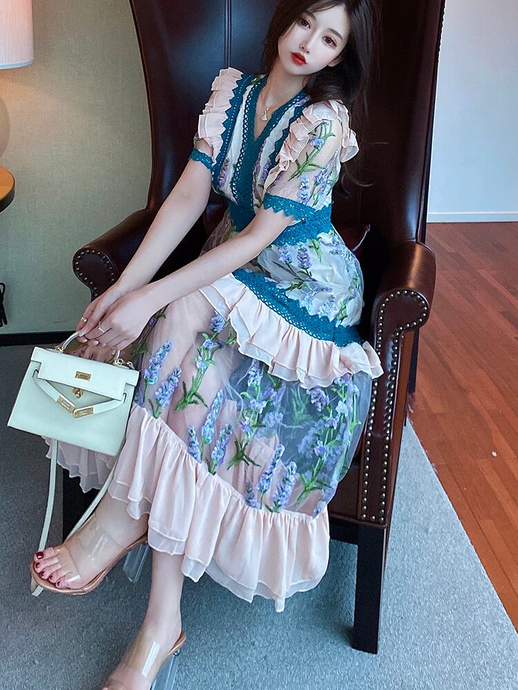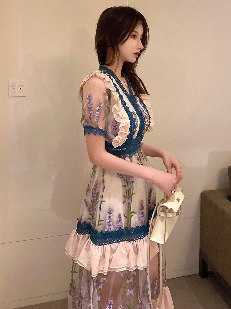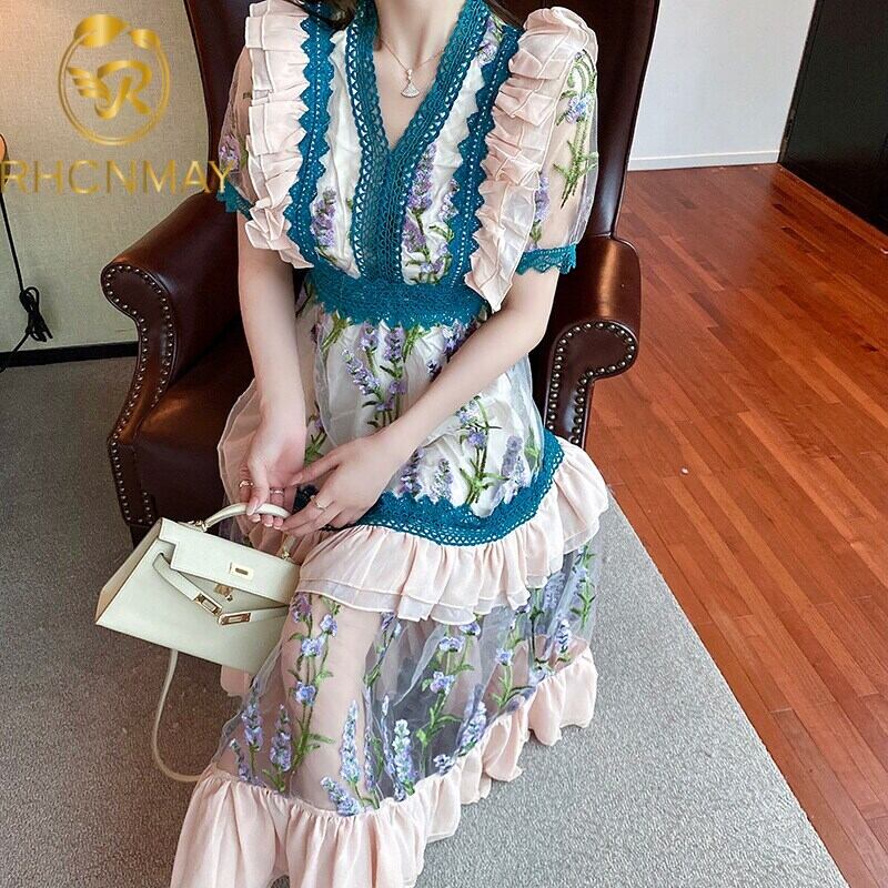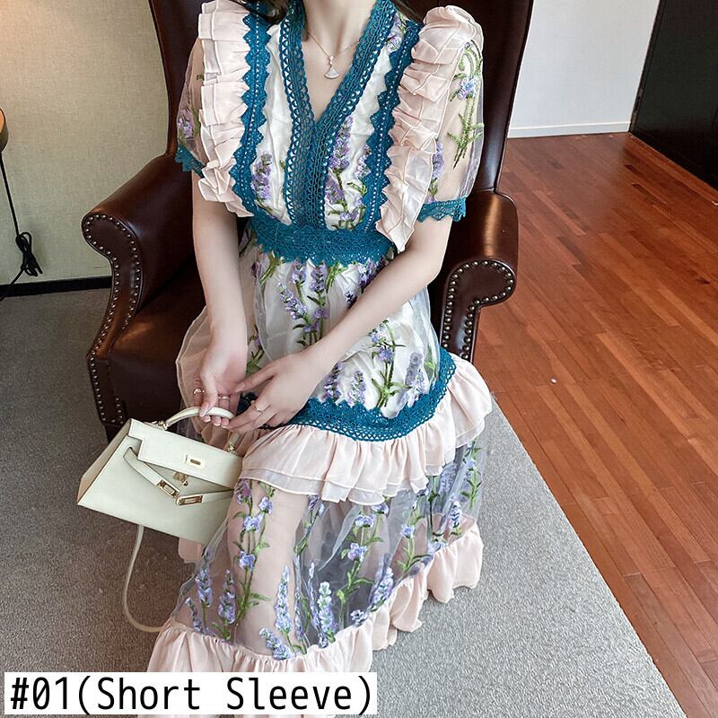 2021ランウェイウィメンズパーティーVネックロングドレスサマーフローラル刺繡メッシュパッチワークレースフリルマキシドレス ラッフル 刺繍 夏物 花柄
