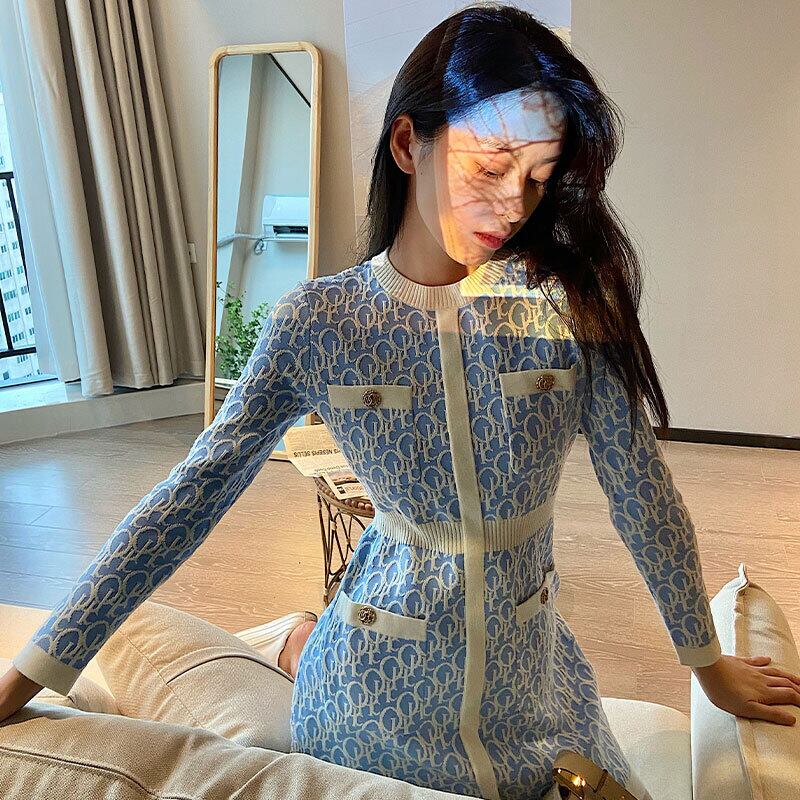ニットセータードレスストリート女性高級長袖ポケットスキニーシースストレートレターチェック柄ドレス ロング