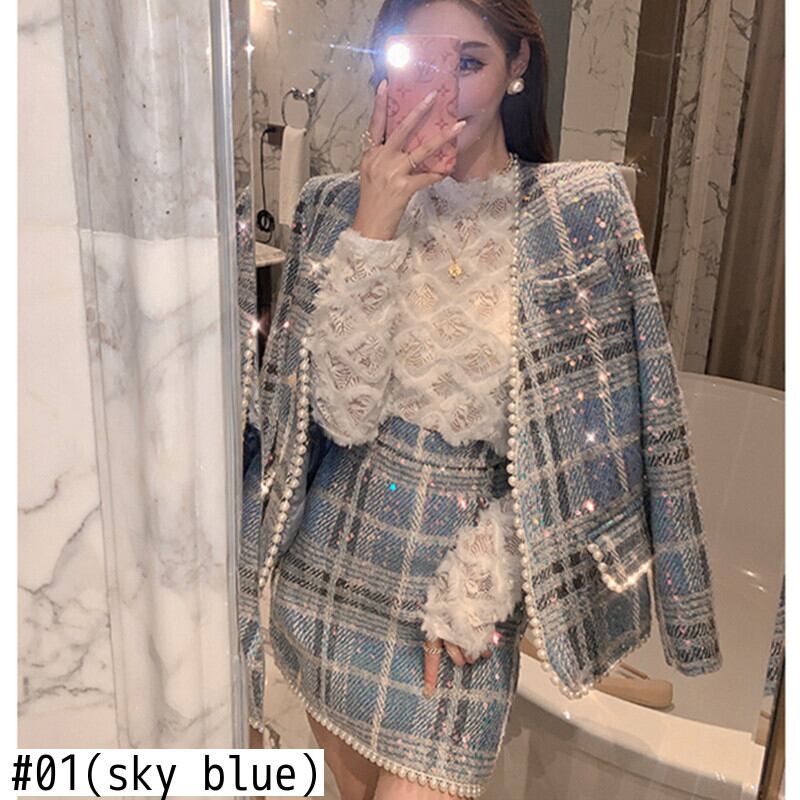 ブルーフレンチスモールフレグランスコートレディース秋2021気質セレブネットツイードスーツスカートツーピースセット オータム 秋物
