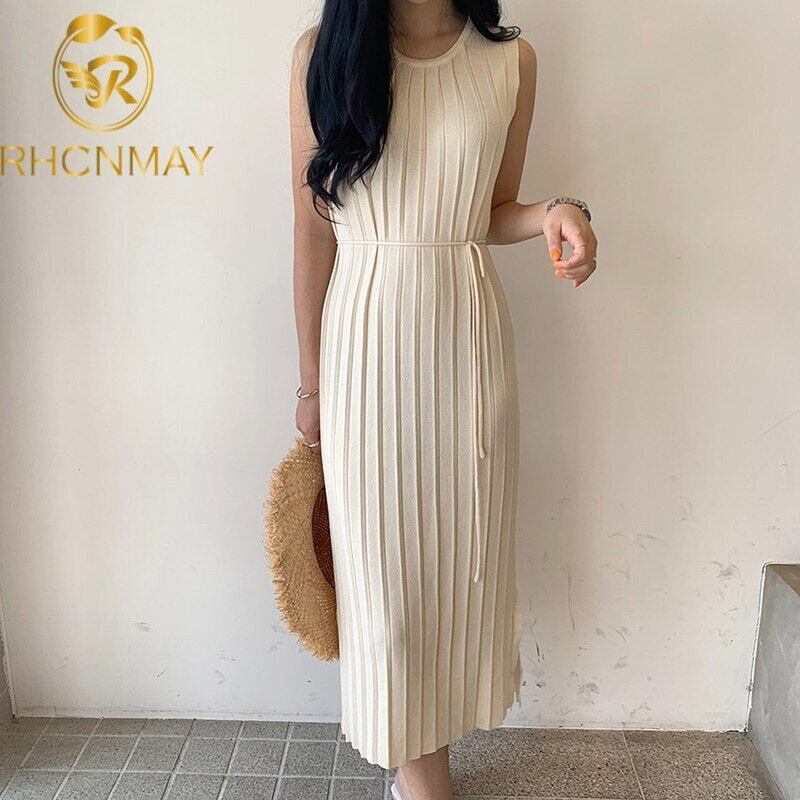夏のニットセータードレス2021女性Oネックストリートウェアプリーツドレスドローストリングスリムベージュプルオーバーミディスプリットドレス サマー 夏物