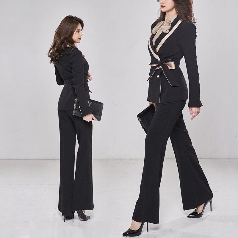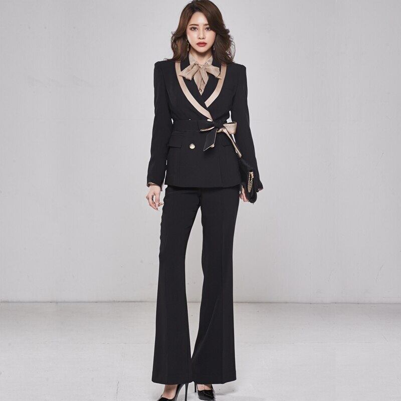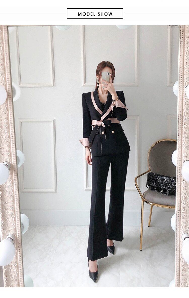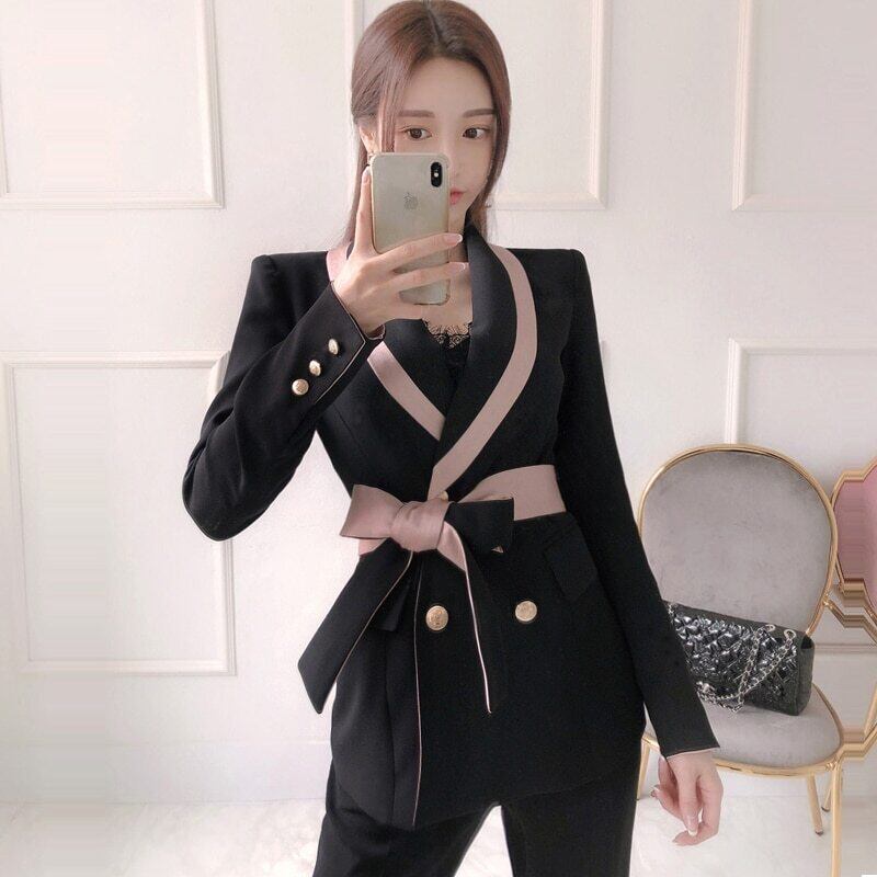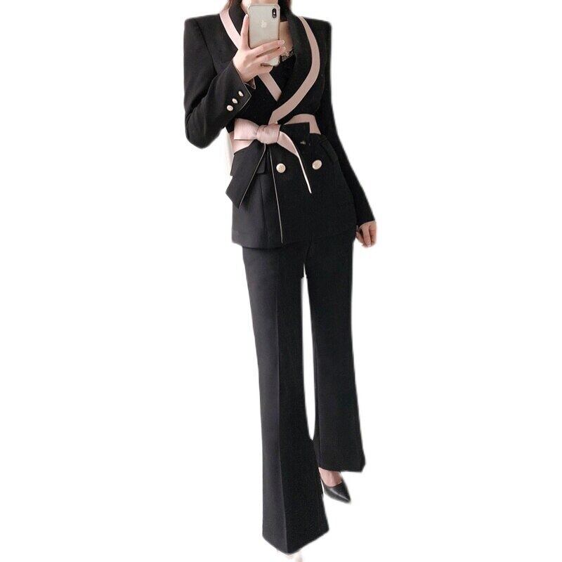 2021年春パンツスーツレースアップブレストジャケットとロングパンツビジネス2ピーススーツスリム作業着ブレザーセット スプリング 春物