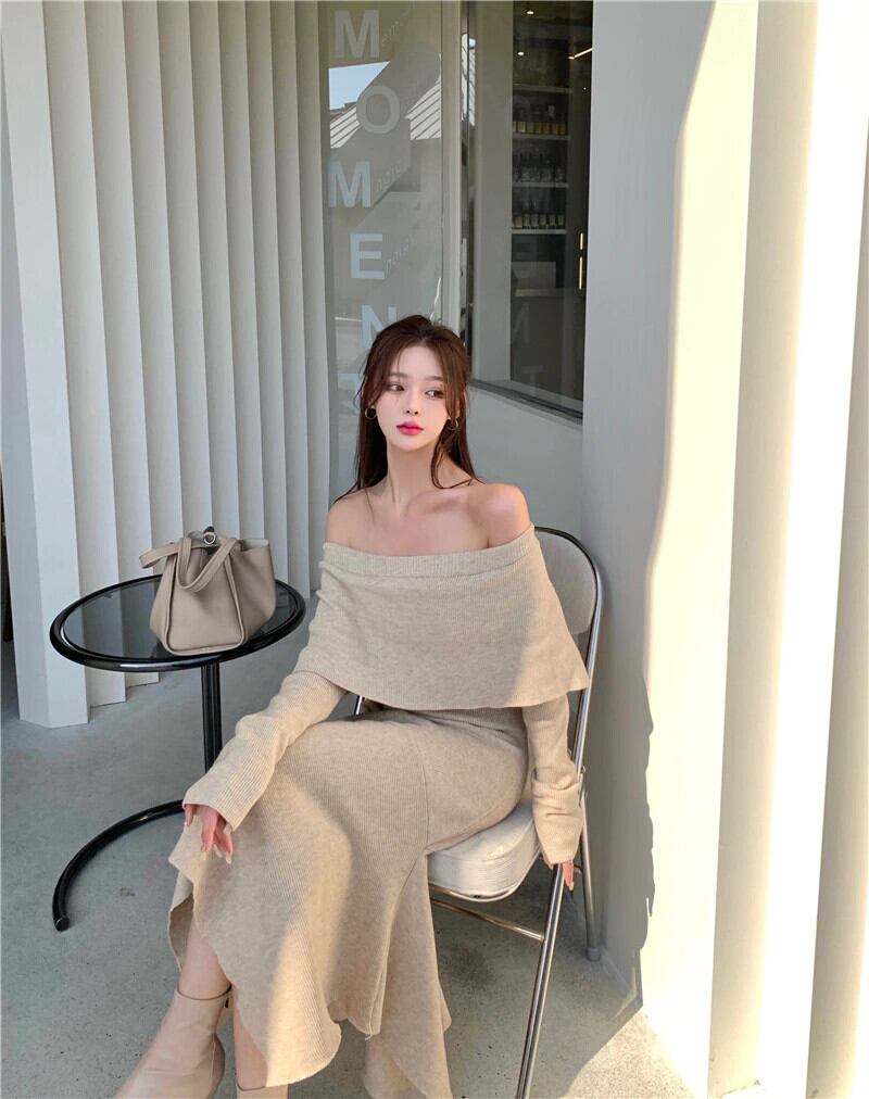 セクシーなフラットコラスリムフィット不規則なニットドレスシックなフレンチスタイルの気質秋冬ドレス女性 オータム 秋物 ウィンター 冬物